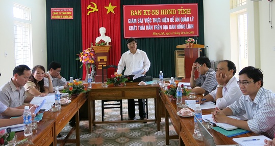 Ngày 24/10/2013, Đoàn giám sát HĐND tỉnh đã có buổi làm việc với UBND huyện Kỳ Anh, Ban quản lý Khu kinh tế Vũng Áng, Công ty CPTVXD quản lý môi trường đô thị Kỳ Anh để nghe báo cáo tình hình thực hiện Nghị quyết số 132/2010/NQ- HĐND ngày 13/10/2010 của HĐND tỉnh về đề án quản lý chất thải rắn trên địa bàn tỉnh Hà Tĩnh đến năm 2015 và đinh hướng những năm tiếp theo. Đồng chí Nguyễn Trí Lạc, Trưởng Ban KT &NS HĐND tỉnh, Trưởng đoàn giám sát chủ trì cuộc làm việc.