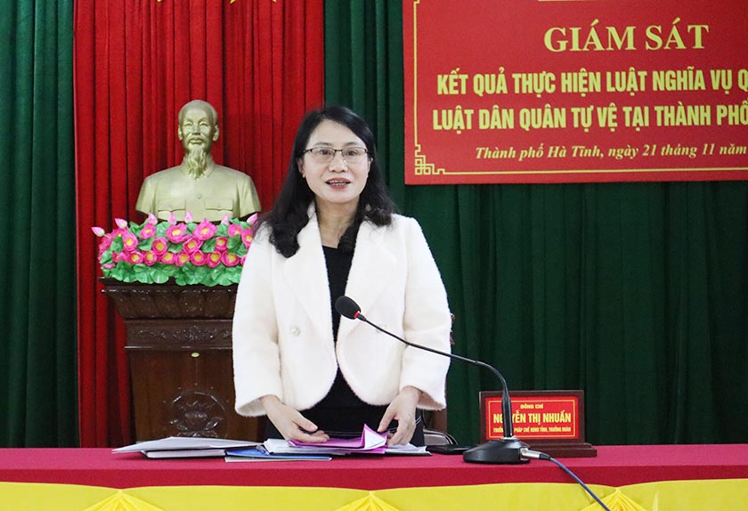Đoàn giám sát “Việc thực hiện Luật nghĩa vụ quân sự (NVQS), Luật dân quân tự vệ (DQTV) trên địa bàn tỉnh, giai đoạn 2021 - 2024” đã làm việc với Hội đồng nghĩa vụ quân sự, Ban Chỉ huy quân sự huyện Đức Thọ và các xã: Thanh Bình Thịnh, Đức Đồng. Trưởng ban Pháp chế Hội đồng nhân dân tỉnh Nguyễn Thị Nhuần chủ trì cuộc làm việc.