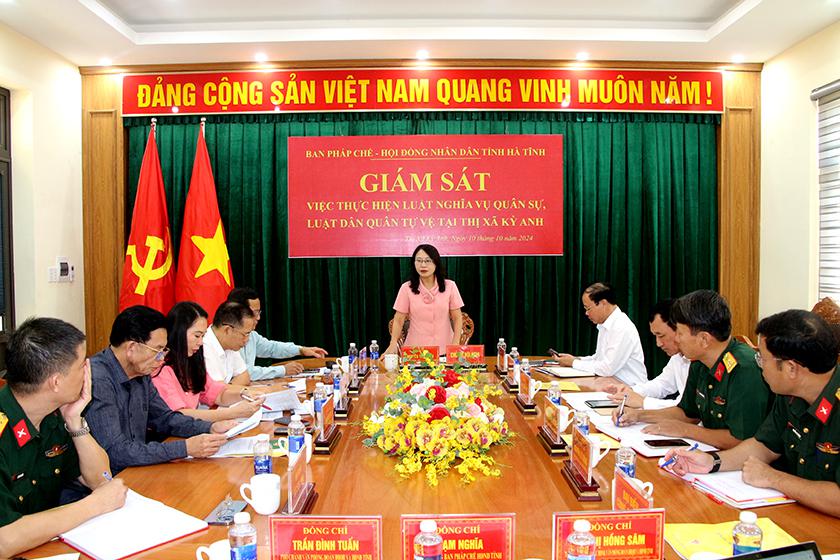 Tiếp tục chương trình giám sát về “Việc thực hiện Luật nghĩa vụ quân sự (NVQS), Luật dân quân tự vệ (DQTV) trên địa bàn tỉnh, giai đoạn 2021-2024”, chiều 10/10/2024, Trưởng ban Pháp chế Hội đồng nhân dân tỉnh Nguyễn Thị Nhuần đã chủ trì làm việc với Hội đồng NVQS, Ban Chỉ huy Quân sự (CHQS) thị xã Kỳ Anh, Phường Hưng Trí và xã Kỳ Hoa.