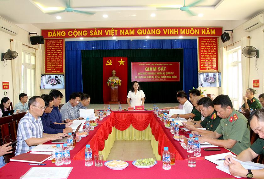 Tiếp tục chương trình giám sát về “Việc thực hiện Luật nghĩa vụ quân sự (NVQS), Luật dân quân tự vệ (DQTV) trên địa bàn tỉnh, giai đoạn 2021-2024”, chiều 11/10/2024, Trưởng ban Pháp chế Hội đồng nhân dân tỉnh Nguyễn Thị Nhuần đã chủ trì làm việc với Hội đồng NVQS, Ban Chỉ huy Quân sự (CHQS) huyện Nghi Xuân.