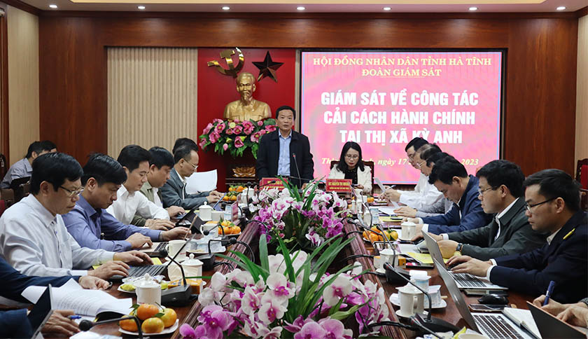 Chiều 17/11, Đoàn giám sát của HĐND tỉnh triển khai giám sát chuyên đề “Công tác cải cách hành chính trên địa bàn tỉnh giai đoạn 2021 – 2023” tại thị xã Kỳ Anh. Phó Chủ tịch HĐND tỉnh Trần Văn Kỳ và Trưởng ban Pháp chế HĐND tỉnh Nguyễn Thị Nhuần chủ trì buổi làm việc.