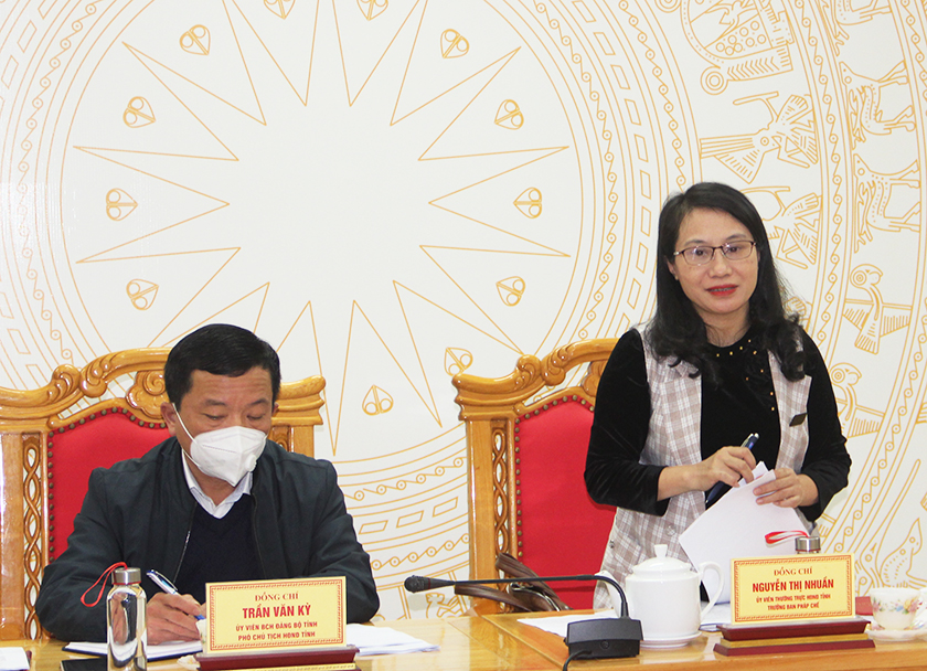 Sáng 6/12/2021, Ban Pháp chế Hội đồng nhân dân (HĐND) tỉnh Hà Tĩnh đã làm việc với Tòa án nhân dân (TAND), Viện Kiểm sát nhân dân (VKSND) và Cục Thi hành án dân sự (THADS) tỉnh để nghe báo cáo về tình hình, kết quả công tác năm 2021, nhiệm vụ năm 2022 của các đơn vị. Phó Chủ tịch HĐND tỉnh Trần Văn Kỳ; Trưởng ban Pháp chế HĐND tỉnh Nguyễn Thị Nhuần chủ trì cuộc làm việc.