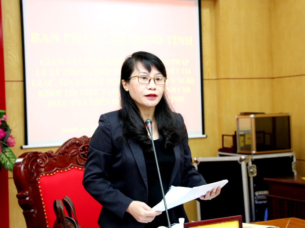 Phó trưởng ban Pháp chế HĐND tỉnh Nguyễn Thị Nhuần phát biểu tại cuộc làm việc