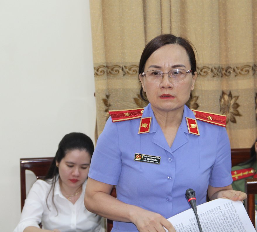 | Viện trưởng Viện KSND tỉnh Hà Tĩnh Lê Thị Quỳnh Hoa: Phối hợp thường xuyên với Tòa án nhân dân trong việc cung cấp đầy đủ bản chính các bản án, trích lục án hình sự để tạo thuận lợi cho cơ quan Thi hành án hình Công an cấp huyện lập hồ bị án và chuyển giao cho chính quyền cơ sở theo dõi, giáo dục đúng quy định |