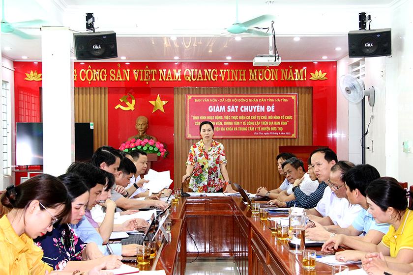 Chiều 26/4/2023, Đoàn giám sát chuyên đề về “tình hình hoạt động, việc thực hiện cơ chế tự chủ, mô hình tổ chức của các bệnh viện, trung tâm y tế công lập trên địa bàn tỉnh” đã khảo sát và làm việc với Trung tâm Y tế (TTYT) huyện Nghi Xuân. Trưởng ban Văn hóa - Xã hội Hội đồng nhân dân (HĐND) tỉnh, Trưởng đoàn giám sát chuyên đề Đào Thị Anh Nga chủ trì cuộc làm việc.