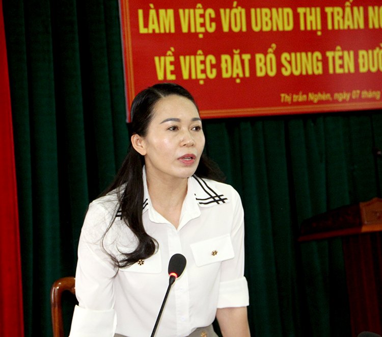 Tại các buổi làm việc, Trưởng ban Văn hóa - Xã hội Đào Anh Nga đánh giá cao công tác chuẩn bị; thu thập tài liệu, tiến hành các bước để xây dựng đề án đặt tên đường của các địa phương và cơ bản thống nhất với việc đề nghị đặt tên các tuyến đường tại thị trấn Nghèn, thị trấn Đồng Lộc (Can Lộc) và thị trấn Đức Thọ (Đức Thọ).