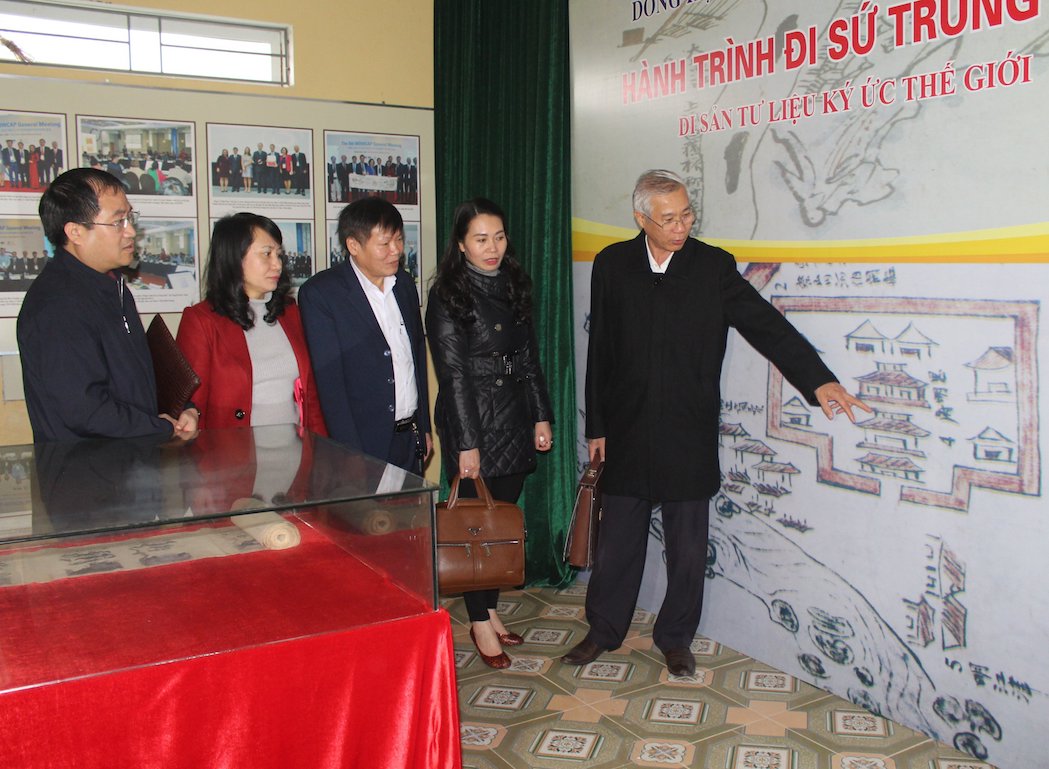 Trưởng Ban Pháp chế HĐND tỉnh Nguyễn Thị Nhuần: huyện cần kế hoạch bảo tồn 2 di sản Mộc bản Trường Trường học Phúc Giang và Hoàng hoa sứ trình đồ được UNESCO công nhận là di sản ký ức thế giới khu vực Châu Á - Thái Bình Dương, đẩy công tác tuyền truyền các giới trẻ tham quan giả ngoại tại BQL Trung tâm bảo tồn di sản văn hóa Trường Lưu xã Kim Song Trường. |