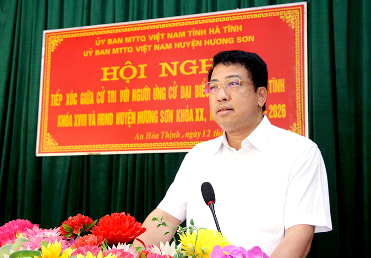 Sáng 12/5, tại xã An Hòa Thịnh, huyện Hương Sơn; Ủy ban Mặt trận Tổ quốc (MTTQ) tỉnh và Ủy ban MTTQ huyện Hương Sơn đã tổ chức Hội nghị tiếp xúc cử tri, vận động bầu cử giữa các ứng cử viên đại biểu Hội đồng nhân dân (HĐND) tỉnh khóa XVIII nhiệm kỳ 2021-2026, đơn vị bầu cử số 11, huyện Hương Sơn và các ứng cử viên đại biểu HĐND huyện Hương Sơn khóa XX, đơn vị bầu cử số 02.