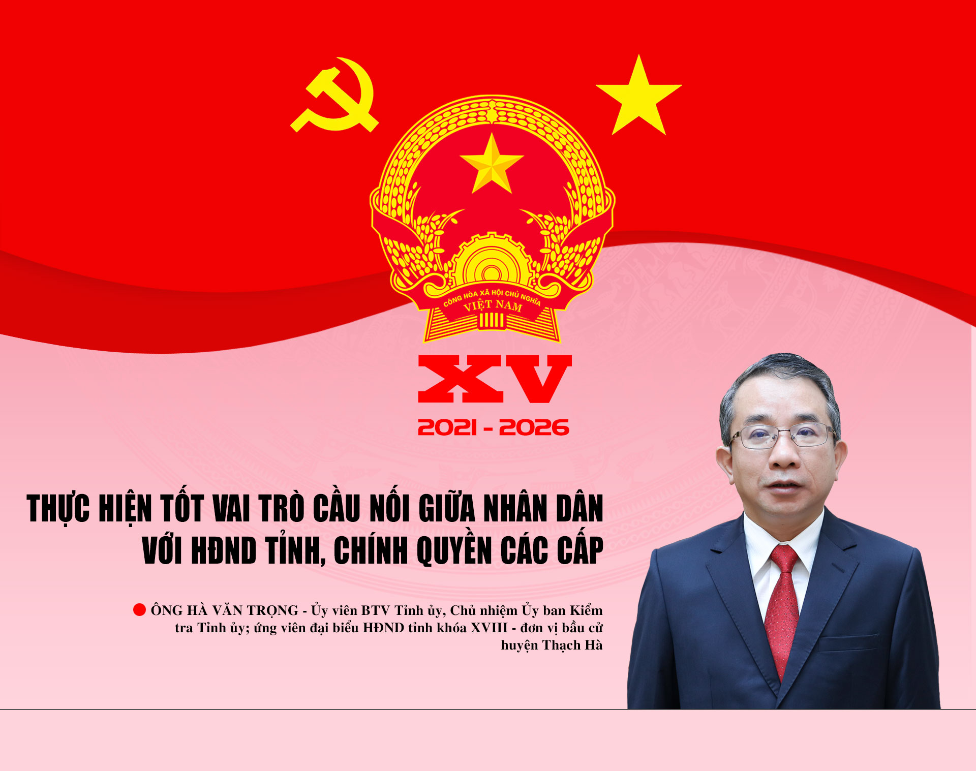 Được Ủy ban MTTQ hiệp thương, Ủy ban Bầu cử tỉnh giới thiệu ứng cử đại biểu HĐND tỉnh nhiệm kỳ 2021-2026 tại đơn vị bầu cử Đức Thọ là vinh dự đi cùng với trách nhiệm lớn của tôi. Nếu được bà con cử tri tín nhiệm bầu làm đại biểu HĐND tỉnh khóa XVIII, tôi có điều kiện thuận lợi hơn thực hiện vai trò, trách nhiệm được giao. Trong chương trình hành động của mình, tôi xin tập trung vào một số nội dung trọng tâm sau đây: