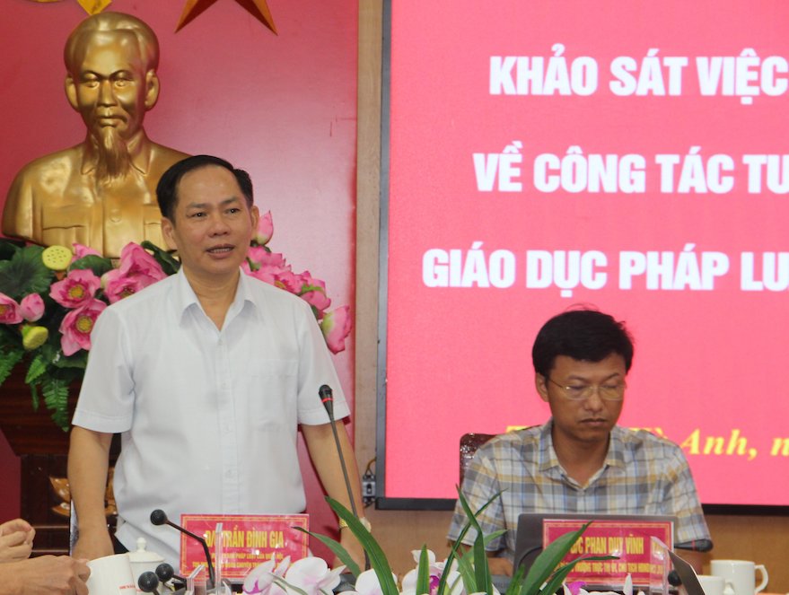 Sáng ngày 18/8/2022, Đoàn đại biểu Quốc hội tỉnh tổ chức khảo sát, làm việc tại thị xã Kỳ Anh về “Việc thực hiện pháp luật về công tác tuyên truyền, phổ biến, giáo dục pháp luật (PBGDPL) giai đoạn 2017 - 2021”. Đồng chí Trần Đình Gia, Ủy viên Ủy ban Pháp luật của Quốc hội, Tỉnh ủy viên, Phó Trưởng đoàn chuyên trách Đoàn ĐBQH tỉnh và Phó Bí thư Thường trực Thị ủy Phan Duy Vĩnh chủ trì cuộc làm việc