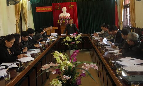 Chiều 23/1/2015, Đoàn ĐBQH tỉnh có buổi làm việc với Tòa án nhân dân tỉnh để thực hiện giám sát chuyên đề về “Tình hình oan, sai trong việc áp dụng pháp luật về hình sự, tố tụng hình sự, về việc bồi thường thiệt hại cho người bị oan trong hoạt động tố tụng hình sự theo quy định của pháp luật” trên địa bàn Hà Tĩnh. Tham dự buổi làm việc có đại diện lãnh đạo Ban Nội chính; Ban TT UBMTTQ tỉnh; Sở Tư Pháp; Đoàn luật sư; Hội Luật gia tỉnh; Đại diện lãnh đạo Tòa án nhân dân( TAND) và các phòng, ban liên quan. Đồng chí Trần Tiến Dũng – Phó Trưởng Đoàn ĐBQH tỉnh chủ trì buổi làm việc.