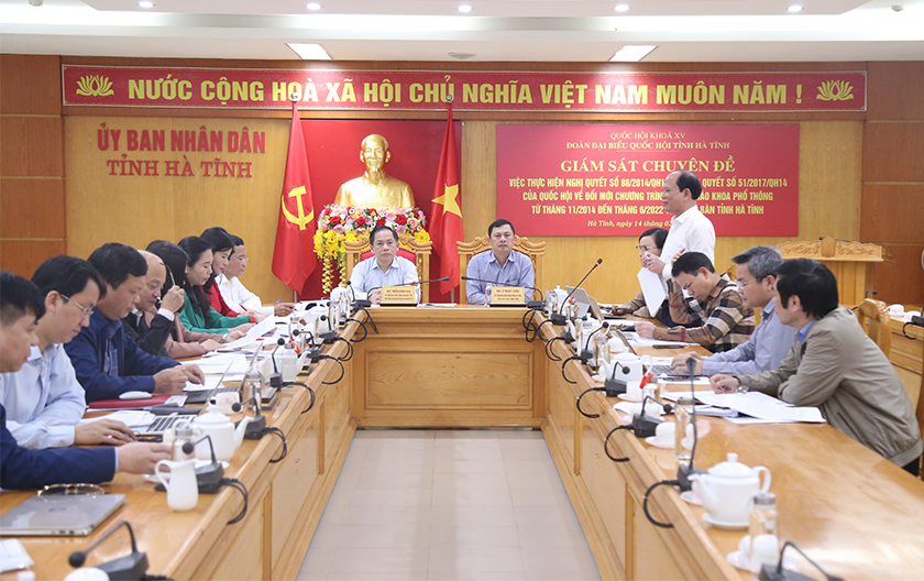 Tại buổi làm việc, đại biểu đã nghe lãnh đạo sở Giáo dục và Đào tạo báo cáo về việc thực hiện Nghị quyết số số 88/2014/QH13 và Nghị quyết số 51/2017/QH14 của Quốc hội về đổi mới chương trình, sách giáo khoa (SGK) giáo dục phổ thông từ tháng 11/2014 đến tháng 6/2022 trên địa bàn tỉnh Hà Tĩnh. Theo đó, năm 2014, Quốc hội đã ban hành Nghị quyết 88 nhằm triển khai cụ thể Nghị quyết số 29-NQ/TW về đổi mới căn bản, toàn diện giáo dục và đào tạo đối với cấp giáo dục phổ thông (từ lớp 1 đến lớp 12), trong đó lấy đổi mới chương trình và SGK giáo dục phổ thông là trọng tâm. Chương trình, SGK giáo dục phổ thông mới bắt đầu triển khai áp dụng theo hình thức cuốn chiếu đối với mỗi cấp tiểu học, trung học cơ sở và trung học phổ thông từ năm 2018.