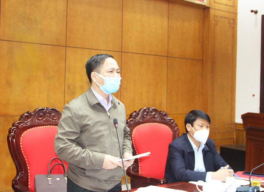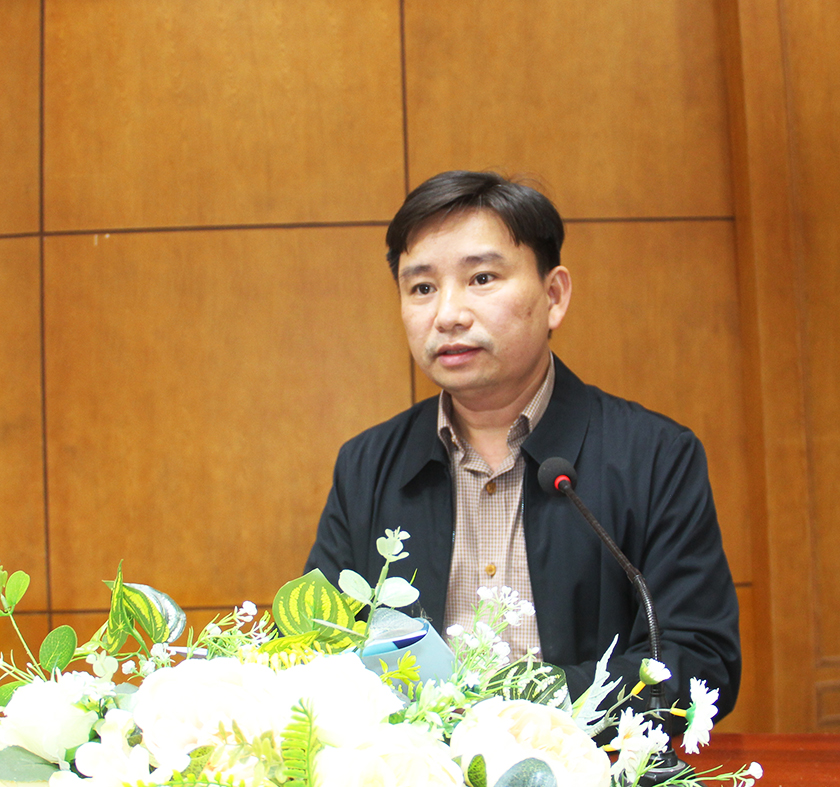 | Phó Chủ tịch UBND huyện Hoàng Xuân Hùng báo cáo tình hình sau sáp nhập ĐVHC cấp xã ở huyện Đức Thọ |