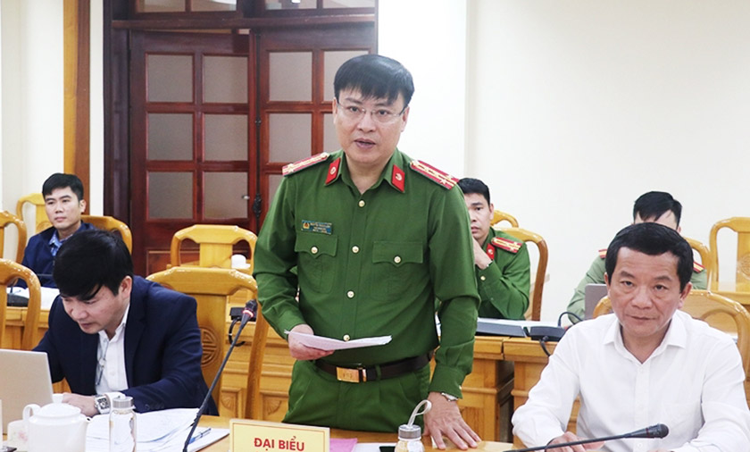 Đại tá Nguyễn Thanh Liêm - Phó Giám đốc Công an tỉnh báo cáo việc chấp hành các quy định của pháp luật về phòng, chống mua bán người trên địa bàn tỉnh |