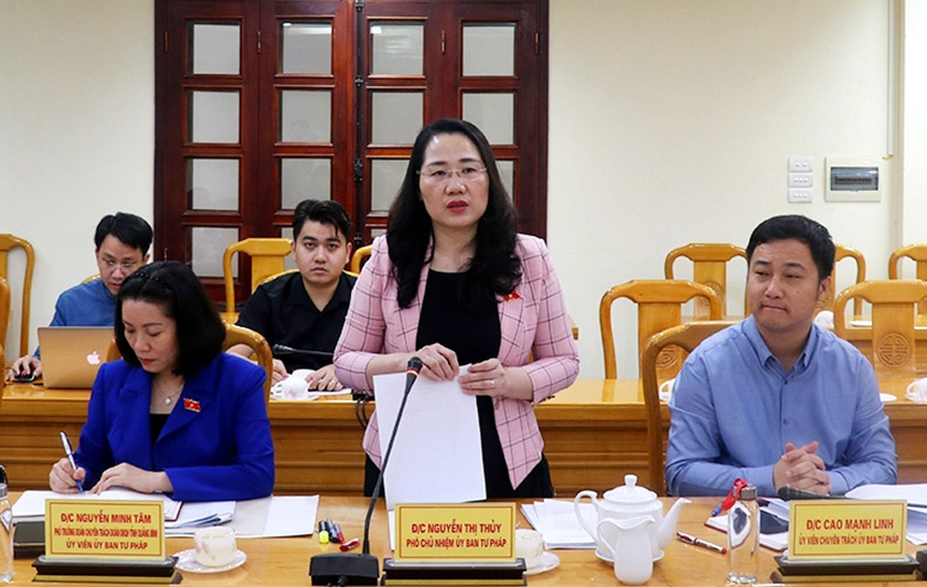| Phó Chủ nhiệm Ủy ban Tư pháp Quốc hội Nguyễn Thị Thủy phát biểu tại buổi làm việc |