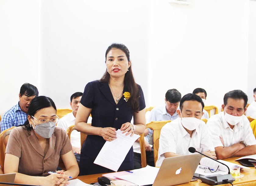 | Trưởng phòng Nội vụ huyện Thạch Hà - Lê Thị Phương Thủy báo cáo kết quả thực hiện sắp xếp đơn vị hành chính trên địa bàn |