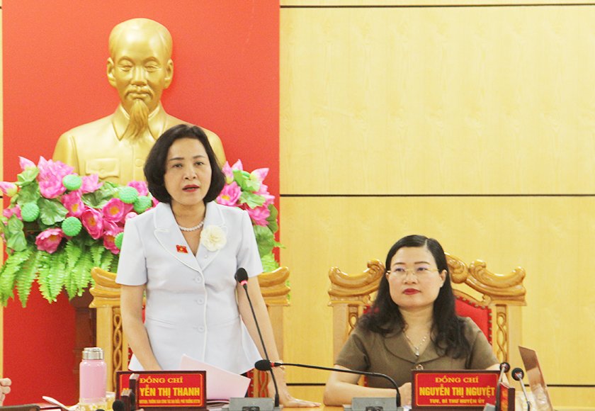 | Phó Trưởng ban Tổ chức Trung ương Nguyễn Thị Thanh và Bí thư Huyện ủy Nguyễn Thị Nguyệt chủ trì buổi làm việc. |