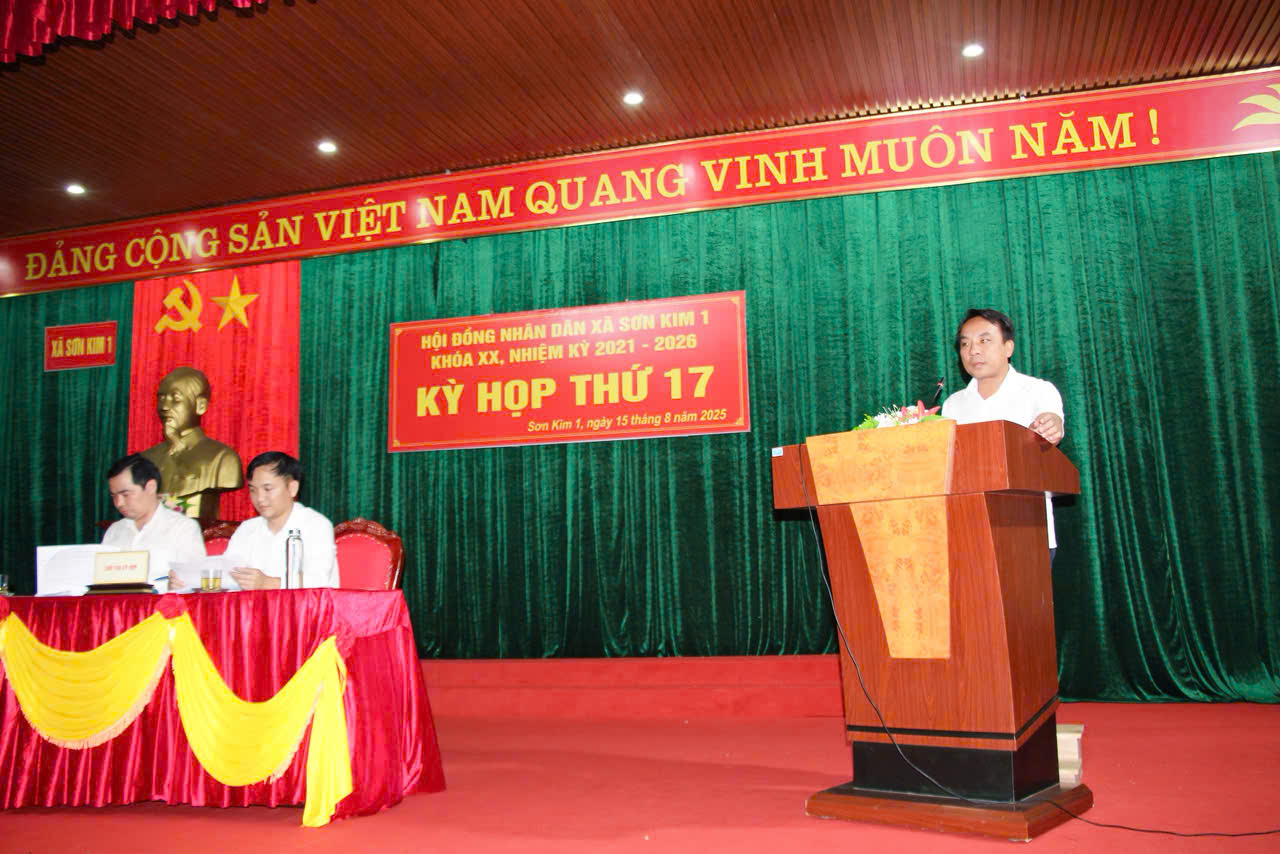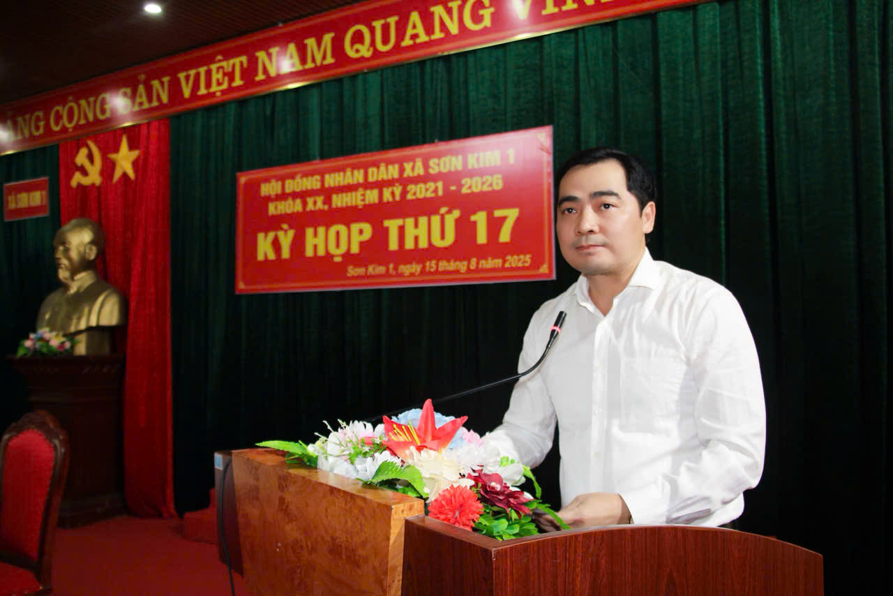 Kỳ họp thứ 17, HĐND xã Sơn Kim 1 đã thông qua 05 nghị quyết về: Việc thực hiện nhiệm vụ phát triển kinh tế - xã hội 5 tháng cuối năm 2025; Phân bổ thu chi ngân sách cuối năm 2025; giao biên chế cán bộ, công chức, người làm việc trong đơn vị sự nghiệp công lập thuộc phạm vi quản lý của UBND xã; kết quả công tác giám sát chuyên đề năm 2025; kế hoạch giám sát chuyên đề năm 2026 của HĐND xã.