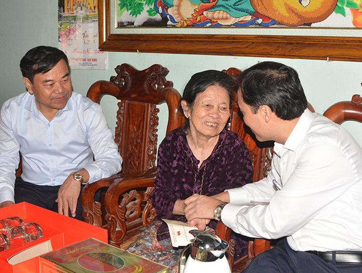 Chủ tịch UBND tỉnh Trần Tiến Hưng, Phó Chủ tịch Thường trực HĐND tỉnh Nguyễn Thị Nữ Y và các đồng chí trong đoàn đã đến thăm, tặng quà các Mẹ VNAH Trần Thị Diệu, 98 tuổi ở thôn Đông Châu, xã Thạch Ngọc (Thạch Hà). Ân cần hỏi thăm, chúc sức khỏe mẹ Trần Thị Diệu, Chủ tịch UBND tỉnh bày tỏ lòng biết ơn sâu sắc tới các mẹ và thế hệ cha anh đi trước đã anh dũng chiến đấu, không tiếc máu xương, sự hi sinh thầm lặng, cao cả của các mẹ vì độc lập dân tộc, xây dựng đất nước.