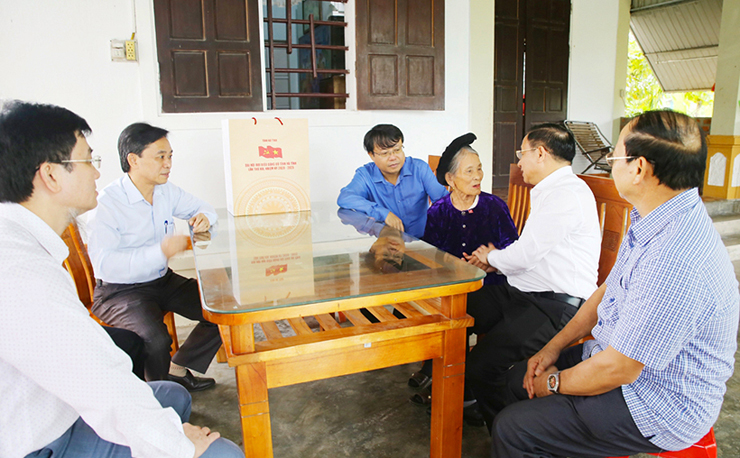 Tại huyện Cẩm Xuyên, Phó Bí thư Thường trực Tỉnh ủy Hoàng Trung Dũng, Trưởng ban Tuyên giáo Tỉnh ủy Võ Hồng Hải thăm và tặng quà Mẹ Việt Nam anh hùng Nguyễn Thị Em (98 tuổi), ở xã Cẩm Bình...
