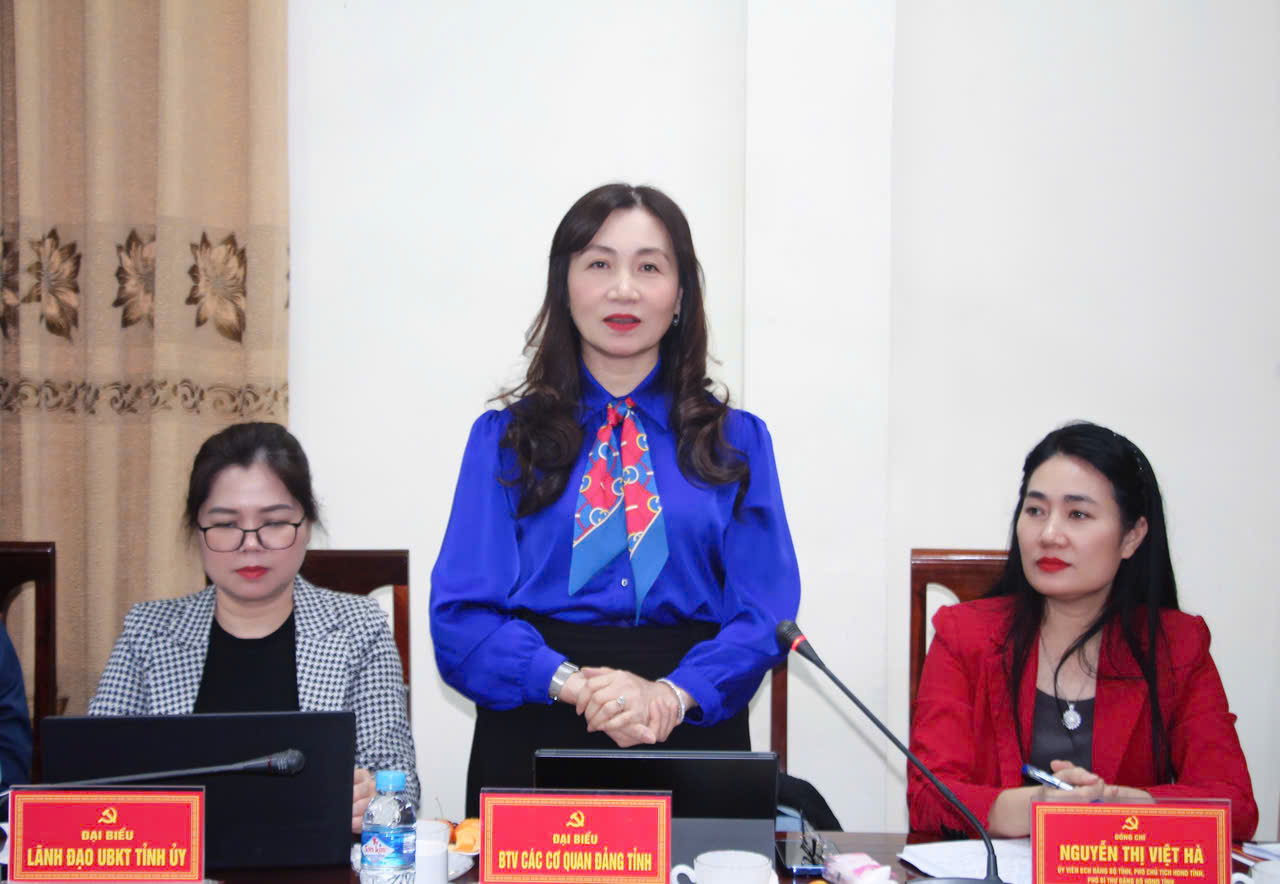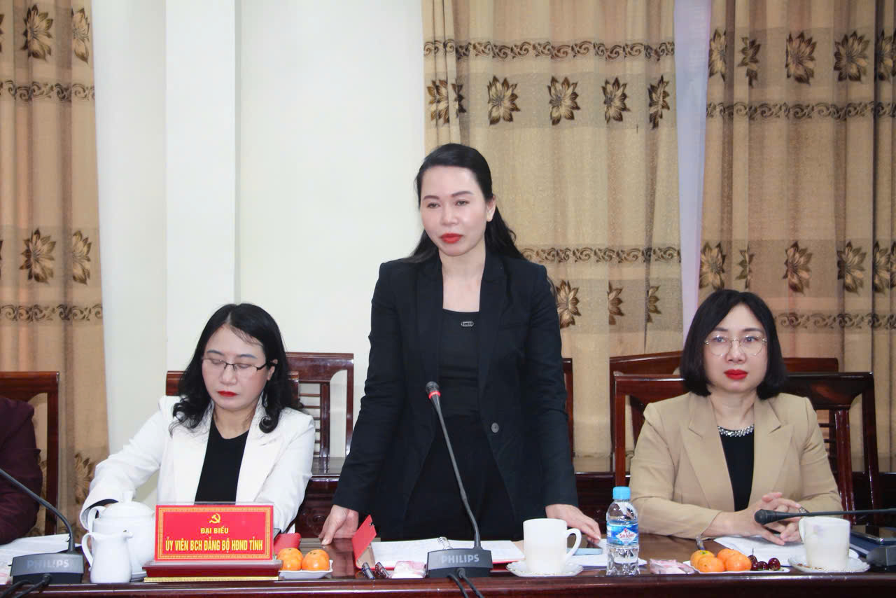 Đồng chí Nguyễn Thị Mai Thủy, Ủy viên Ban Chấp hành Đảng bộ tỉnh, Phó Bí thư Đảng ủy các cơ quan Đảng tỉnh phát biểu tại Hội nghị. |