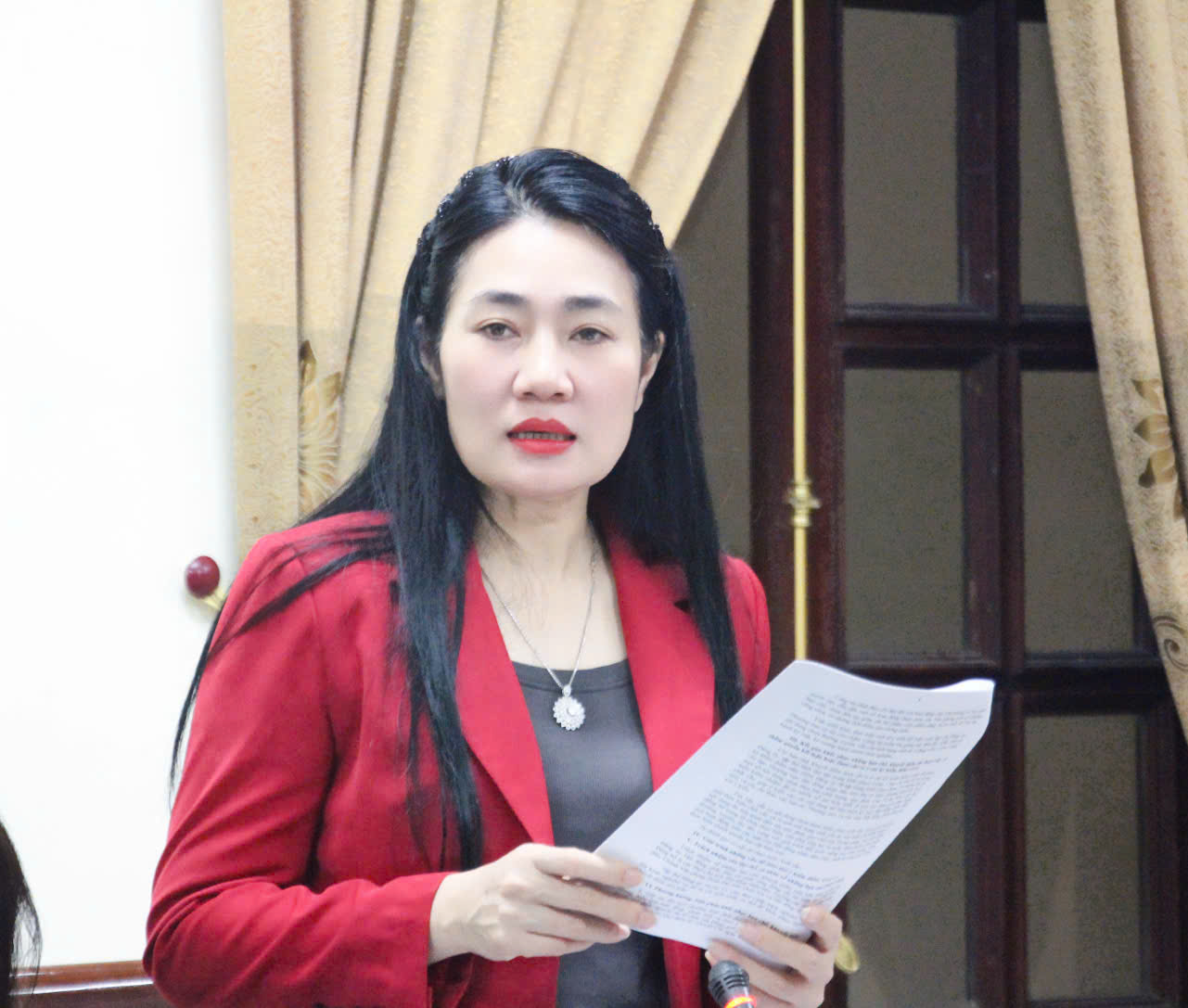 Đồng chí Nguyễn Thị Việt Hà, Ủy viên Ban Chấp hành Đảng bộ tỉnh, Phó Bí thư Đảng ủy báo cáo tại hội nghị. |