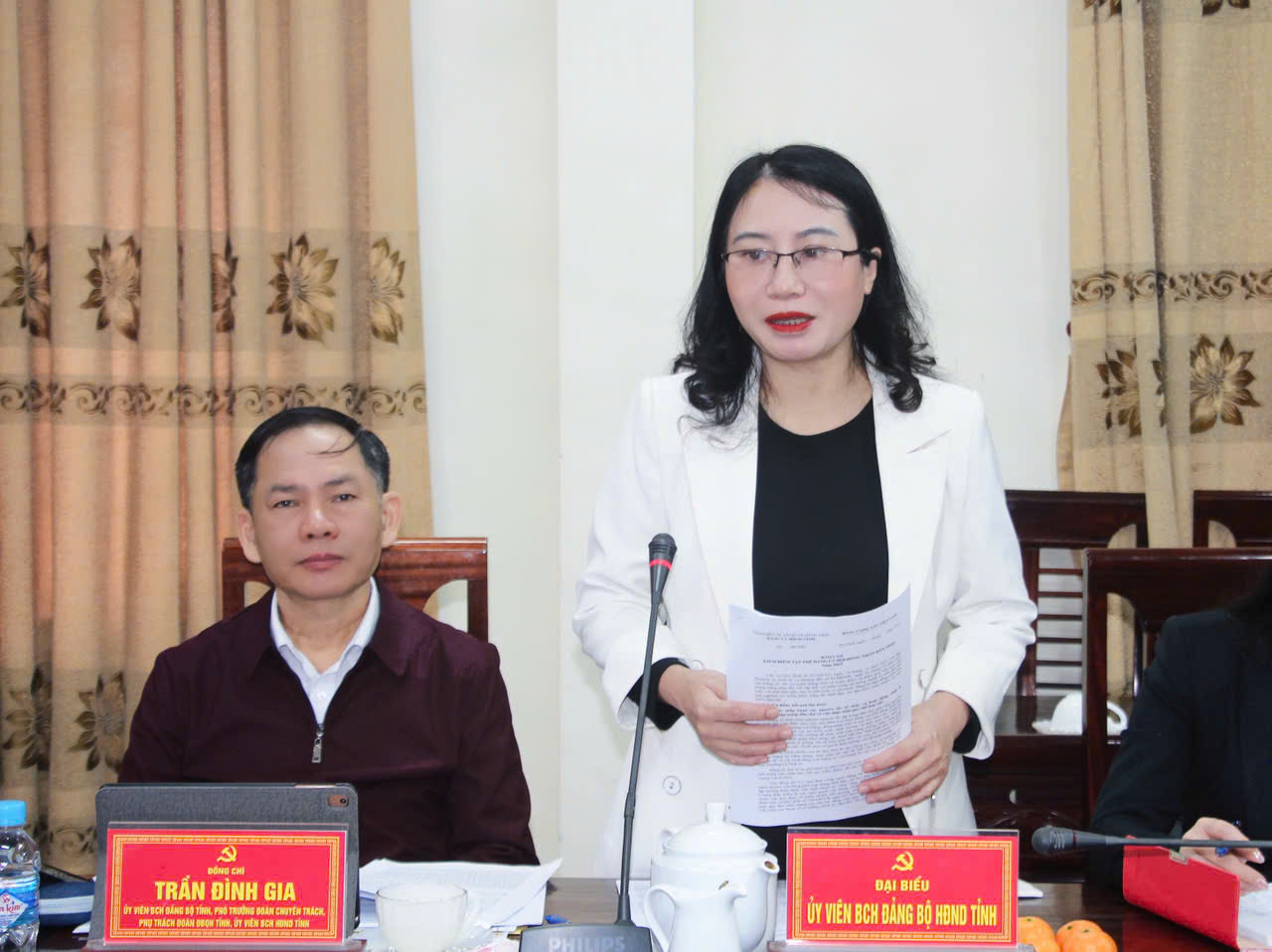 Đồng chí Nguyễn Thị Thúy Nga, Ủy viên Ban Chấp hành Đảng bộ Hội đồng nhân dân tỉnh: đề nghị Đảng ủy các cơ quan Đảng tỉnh khi đánh giá đại biểu Hội đồng nhân dân tỉnh cần có ý kiến của Đảng ủy Hội đồng nhân dân tỉnh. |