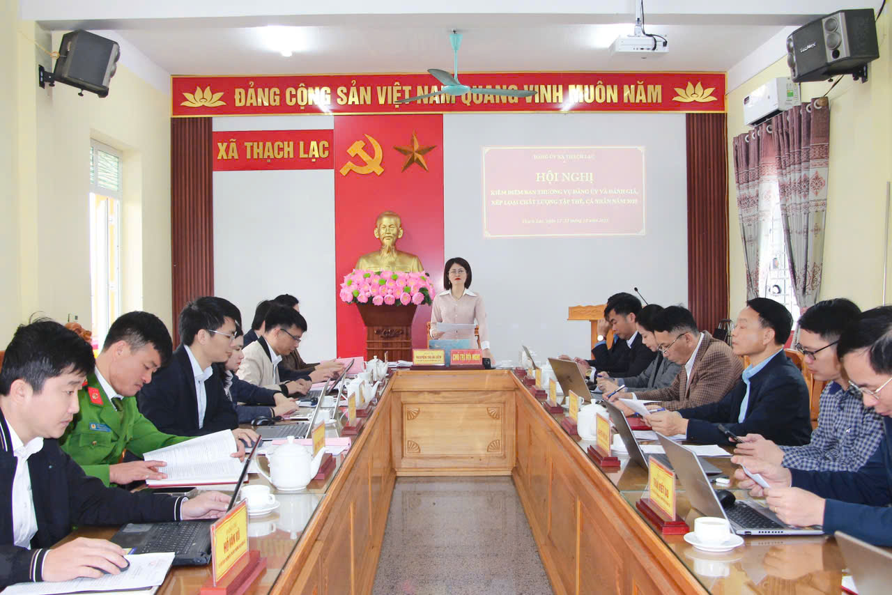 Tại hội nghị, Phó Bí thư Thường trực Đảng ủy xã Thạch Lạc Trương Đình Dũng đã báo cáo kiểm điểm tập thể Ban Thường vụ Đảng ủy xã năm 2025. Theo đó, về công tác xây dựng Đảng, hệ thống chính trị, trong năm, Ban Thường vụ Đảng ủy xã đã quan tâm đúng mức đến công tác chính trị tư tưởng; duy trì nền nếp sinh hoạt, giữ vững nguyên tắc tập trung dân chủ, tự phê bình và phê bình. Công tác đào tạo, bồi dưỡng, bố trí, sử dụng cán bộ được chú trọng; công tác kiểm tra, giám sát có nhiều chuyển biến; hoạt động của Ủy ban MTTQ và các đoàn thể ngày càng sát dân, góp phần giải quyết kịp thời nhiều kiến nghị, nguyện vọng chính đáng của Nhân dân. Công tác tổ chức, cán bộ, đảng viên, phòng chống tham nhũng, tiêu cực; công tác kiểm tra, giám sát được thực hiện nghiêm túc.