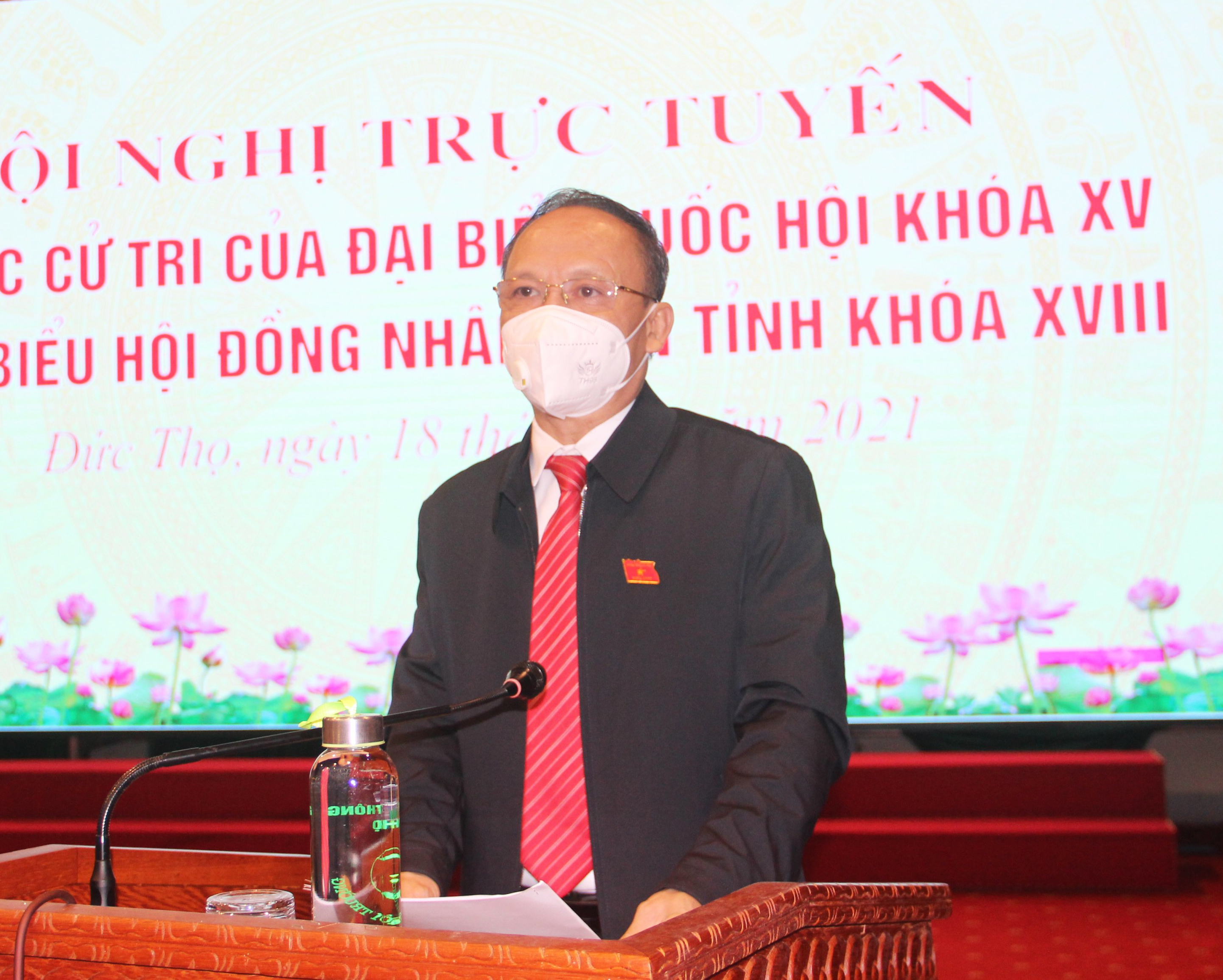 Tiếp thu các ý kiến, kiến nghị của cử tri, Chủ tịch UBND tỉnh Võ Trọng Hải đã ghi nhận những ý kiến phát biểu tâm huyết, trách nhiệm của cử tri huyện Đức Thọ. Đối với các ý kiến, kiến nghị của cử tri thuộc thẩm quyền trách nhiệm thuộc cấp tỉnh, cấp huyện thì yêu cầu các sở, ngành và địa phương quan tâm, chủ động giải quyết các nội dung kiến nghị thuộc thẩm quyền và thông báo tới cử tri về kết quả giải quyết trong thời gian sớm nhất. Theo đó, Hà Tĩnh là địa phương nằm trong top đầu cả nước về tỷ lệ tiêm vắc- xin phòng dịch COVID-19. Cùng với tập trung chỉ đạo thực hiện “mục tiêu kép” vừa sản xuất vừa phòng chống dịch bệnh, Hà Tĩnh tiếp tục thực hiện chỉ đạo của Chính phủ “Thích ứng an toàn, linh hoạt, kiểm soát hiệu quả dịch COVID-19”. Hà Tĩnh cũng đã thực hiện hiệu quả công tác an sinh xã hội, kêu gọi sự chung tay hỗ trợ của các tổ chức, cá nhân xây dựng nhiều ngôi nhà cộng đồng tránh lũ và nhà ở cho hộ nghèo, hộ có hoàn cảnh khó khăn; hỗ trợ học sinh gặp hoàn cảnh khó khăn đạt điểm cao học đại học.
