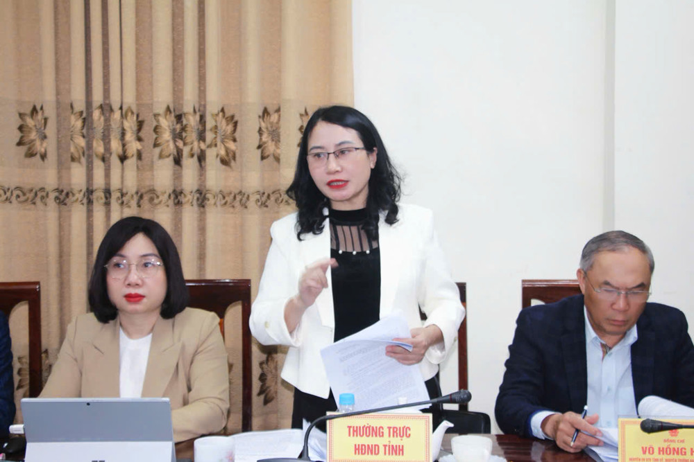 | Trưởng ban Pháp chế Hội đồng nhân dân tỉnh Nguyễn Thị Nhuần: đề nghị xem xét kỹ, đảm bảo các tờ trình, dự thảo Nghị quyết đúng quy định pháp luật |