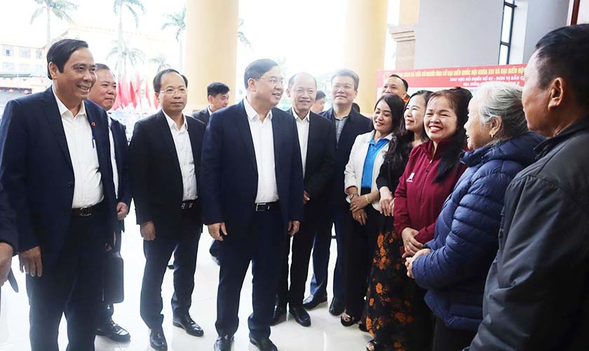 Các đồng chí: Phạm Gia Túc - Ủy viên Bộ Chính trị, Bí thư Trung ương Đảng, Chánh Văn phòng Trung ương Đảng; Nguyễn Thanh Bình - Chủ tịch Hội Người cao tuổi Việt Nam; Nguyễn Duy Lâm - Bí thư Tỉnh ủy cùng các đại biểu trò chuyện với cử tri phường Bắc Hồng Lĩnh |