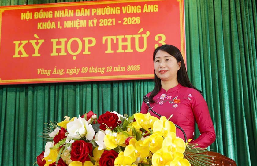 Phát biểu tại kỳ họp, Trưởng Ban Pháp chế HĐND tỉnh Nguyễn Thị Nhuần ghi nhận, đánh giá cao những nỗ lực và kết quả mà phường Vũng Áng đạt được trong năm 2025, nhất là trong bối cảnh còn nhiều khó khăn do thiên tai và yêu cầu sắp xếp, vận hành mô hình chính quyền địa phương hai cấp; là địa bàn trọng điểm của tỉnh có nhiều dự án tập trung cao cho công tác giải phóng mặt bằng. Đồng chí đề nghị địa phương tiếp tục bám sát nghị quyết HĐND các cấp, tập trung tháo gỡ khó khăn, khai thác hiệu quả tiềm năng, lợi thế để thực hiện thắng lợi các mục tiêu phát triển kinh tế – xã hội năm 2026; đồng thời chuẩn bị chu đáo, tập trung cao cho công tác bầu cử đại biểu Quốc hội và đại biểu HĐND các cấp nhiệm kỳ 2026–2031, bảo đảm đúng quy định của pháp luật.