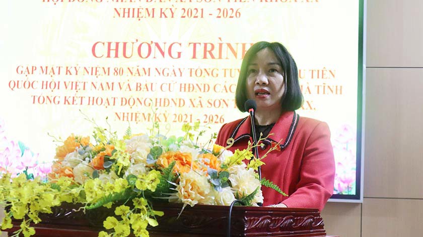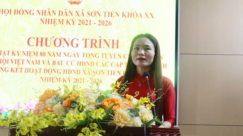 Phát biểu tại hội nghị, đồng chí Nguyễn Thị Thúy Nga – Trưởng Ban Kinh tế – Ngân sách HĐND tỉnh ghi nhận, đánh giá cao những kết quả HĐND xã Sơn Tiến đạt được trong nhiệm kỳ qua, nhất là trong bối cảnh xã mới sáp nhập, địa bàn rộng. Đồng chí đề nghị HĐND xã tiếp tục đổi mới, nâng cao chất lượng hoạt động; chú trọng giám sát việc thực hiện các nghị quyết, các lĩnh vực kinh tế – ngân sách; nâng cao vai trò, trách nhiệm của đại biểu HĐND, đáp ứng yêu cầu nhiệm vụ trong giai đoạn mới.