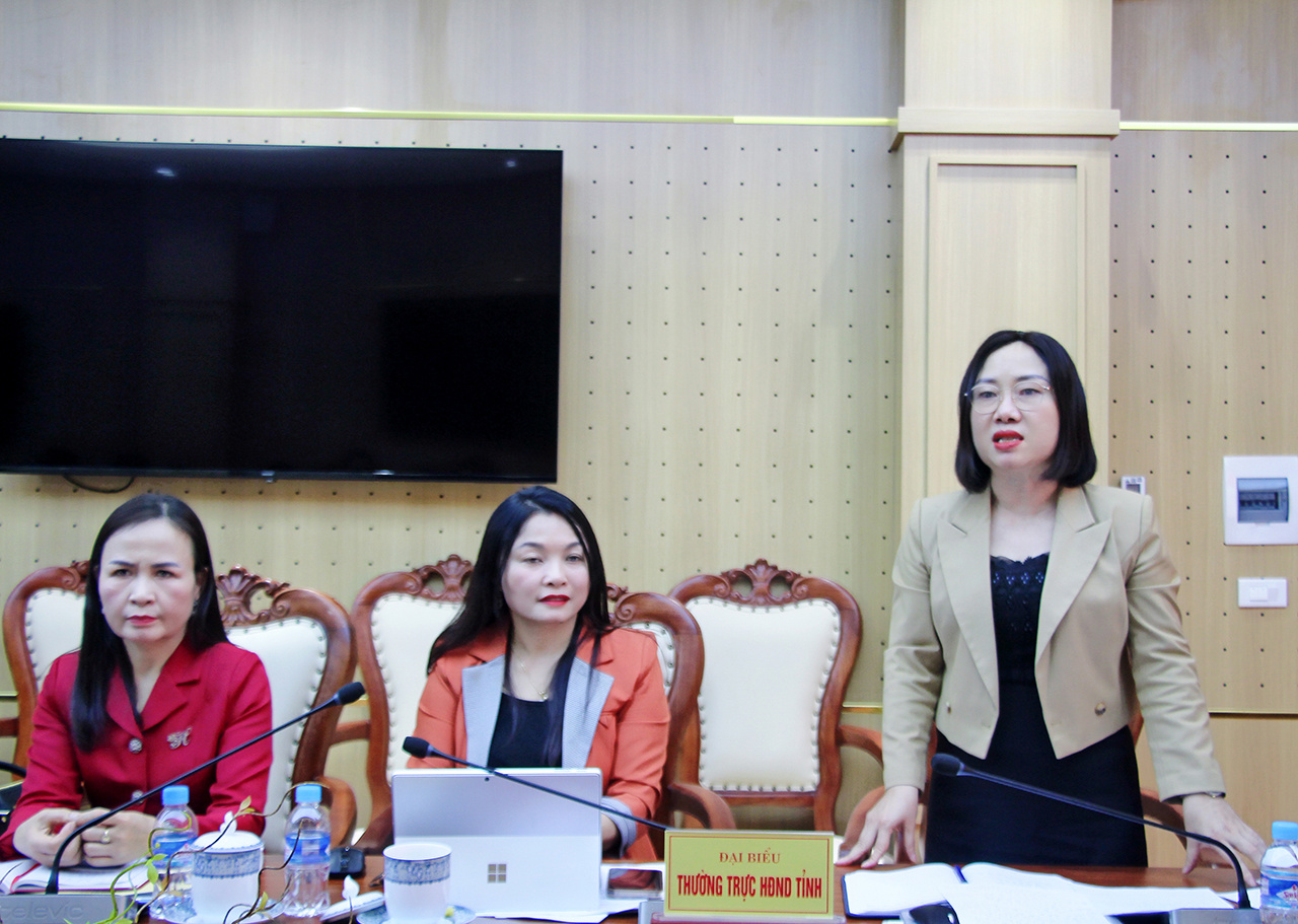 Trưởng ban Văn hóa - Xã hội Hội đồng nhân dân tỉnh Đào Thị Anh Nga phát biểu tại cuộc làm việc. |