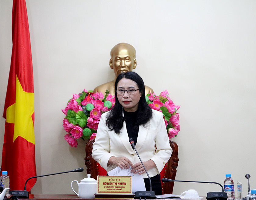 Phát biểu tại cuộc làm việc, Trưởng ban Pháp chế HĐND tỉnh Nguyễn Thị Nhuần đề nghị các đơn vị phối hợp chặt chẽ trong sửa đổi, hoàn thiện các tờ trình, dự thảo Nghị quyết, Đề án trình kỳ họp thứ 25, HĐND tỉnh khóa XVIII.