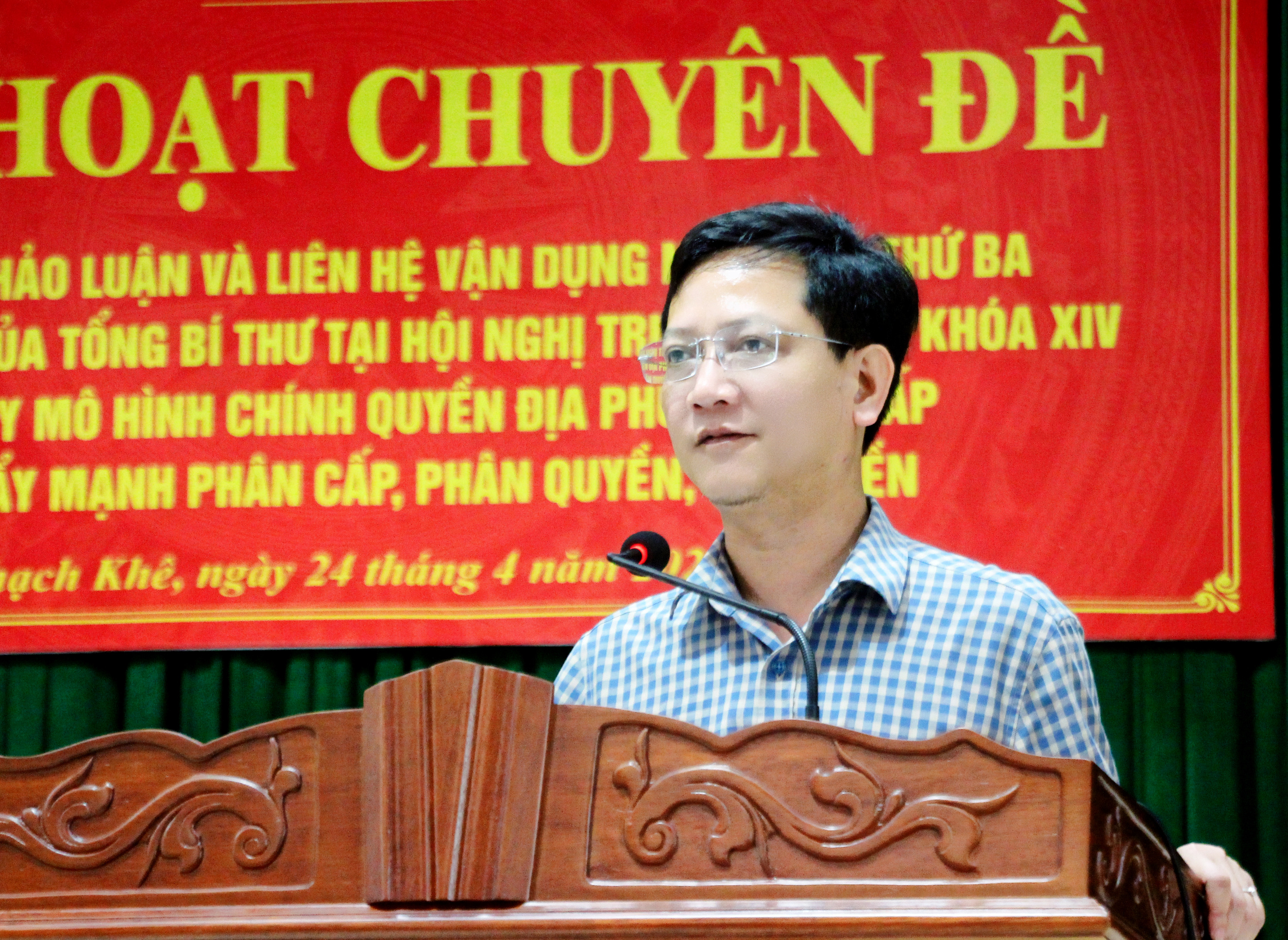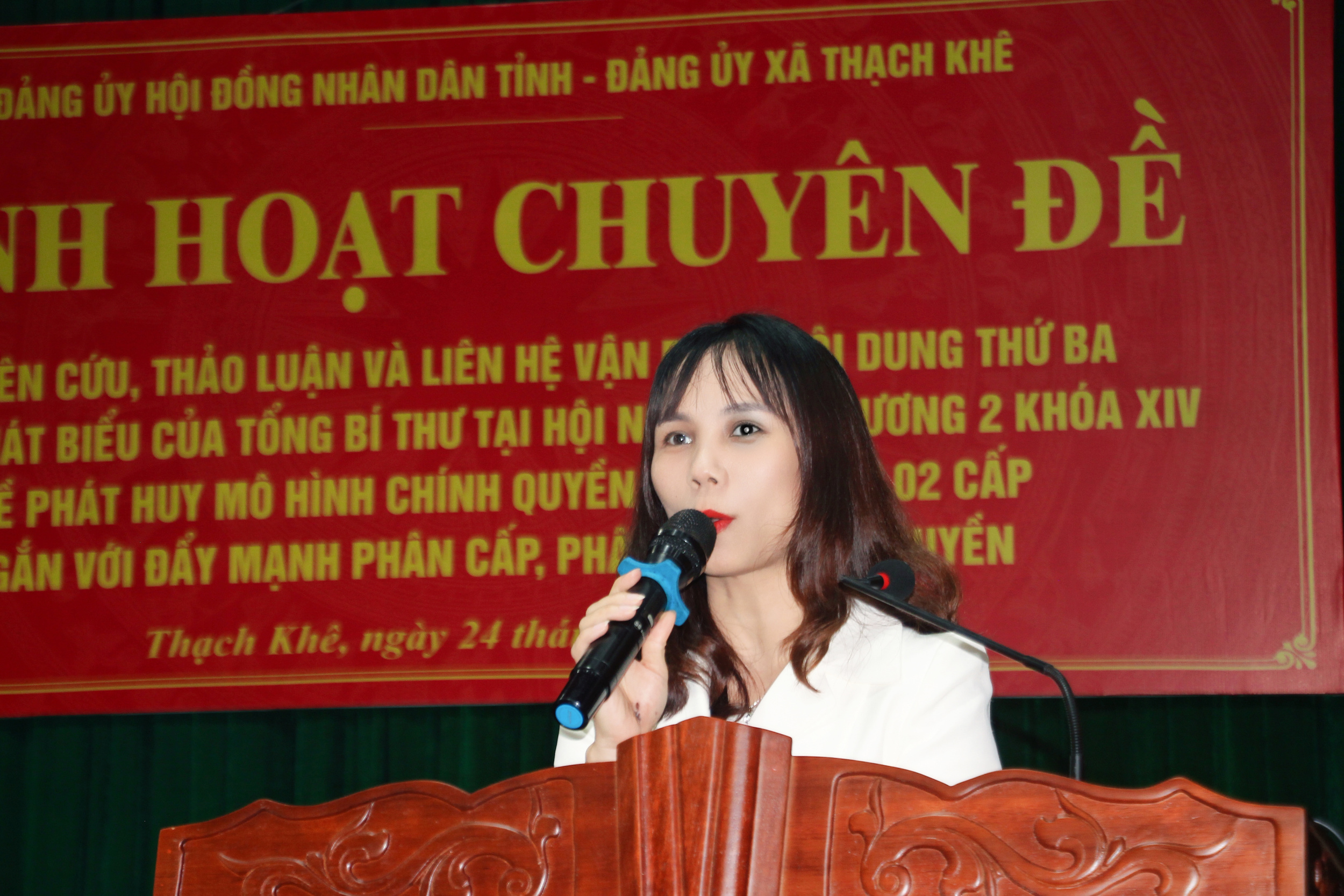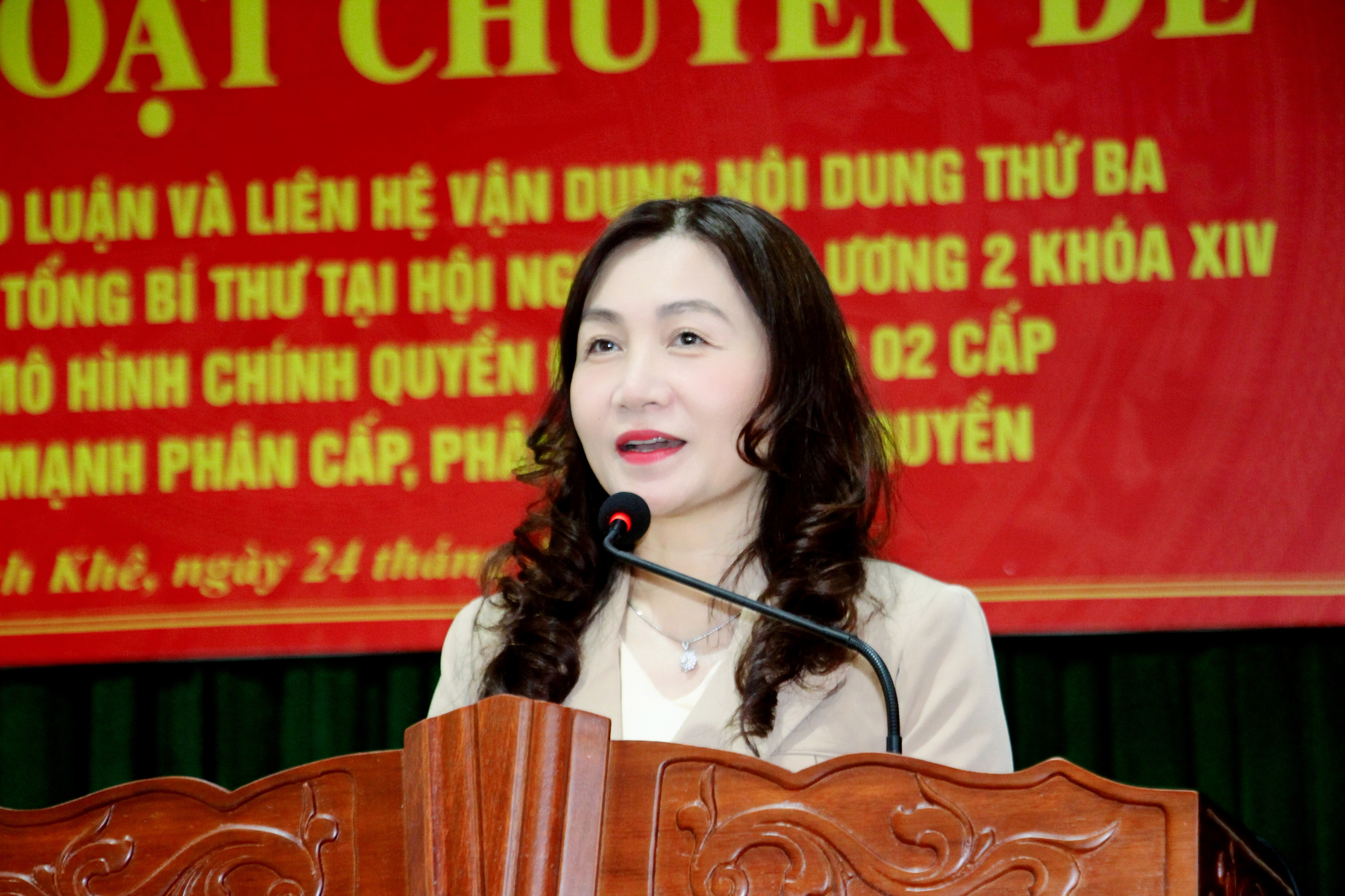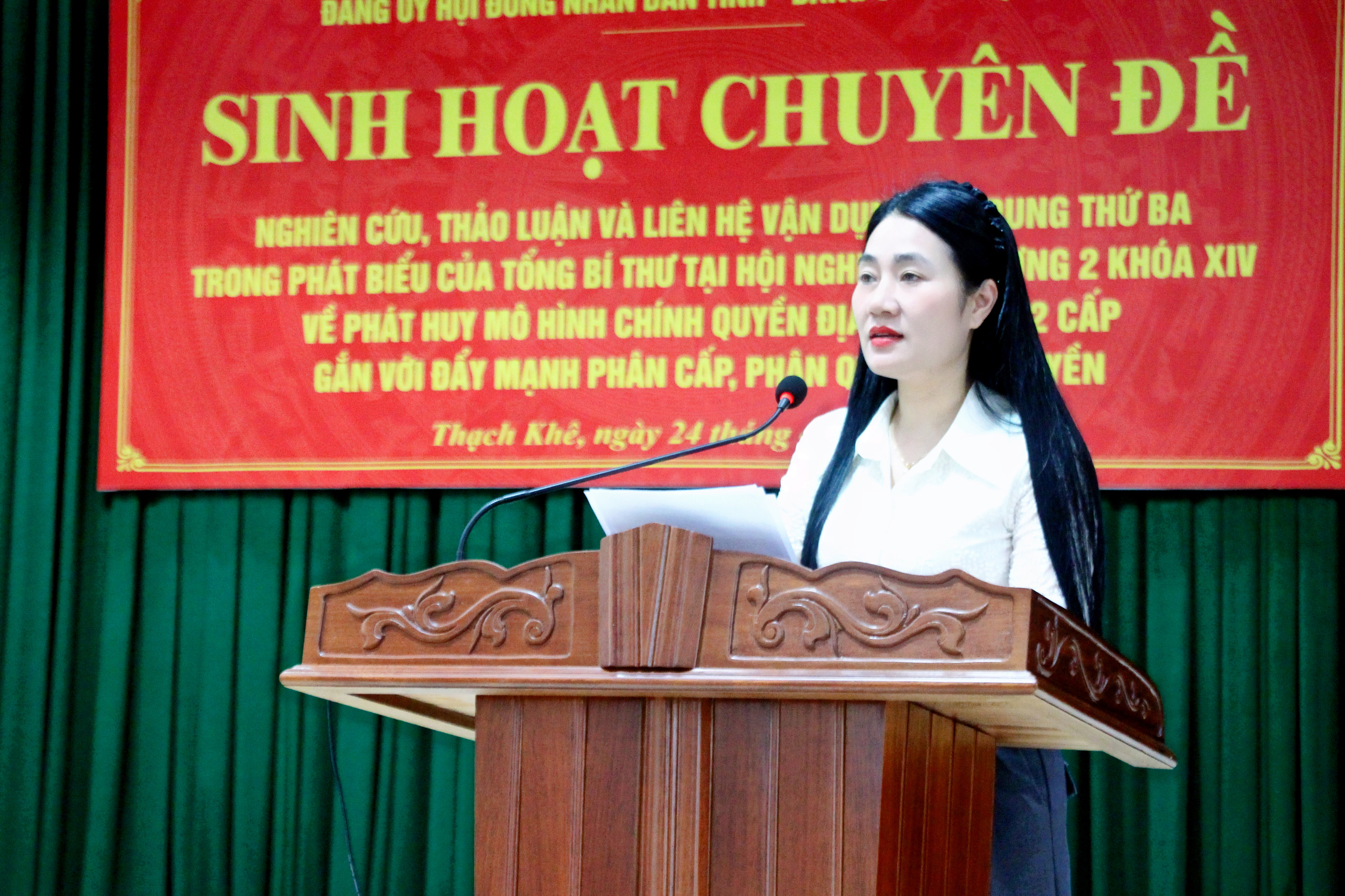 Tiếp đó, phát biểu đề dẫn sinh hoạt chuyên đề, Phó Chủ tịch HĐND tỉnh Nguyễn Thị Việt Hà cho rằng: Tinh thần cốt lõi nội dung thứ ba trong bài phát biểu của Tổng Bí thư là phải coi mô hình chính quyền địa phương 02 cấp hiện nay không chỉ là mô hình tổ chức hành chính mới, mà là phương thức quản trị địa phương mới; không chỉ giảm tầng nấc trung gian, mà phải đồng thời đổi mới cơ chế phân quyền, phân cấp, ủy quyền; thiết kế lại quy trình xử lý công việc; chuẩn hóa dữ liệu; làm rõ trách nhiệm người đứng đầu và chuyển mạnh từ hành chính quản lý sang hành chính phục vụ, kiến tạo phát triển.