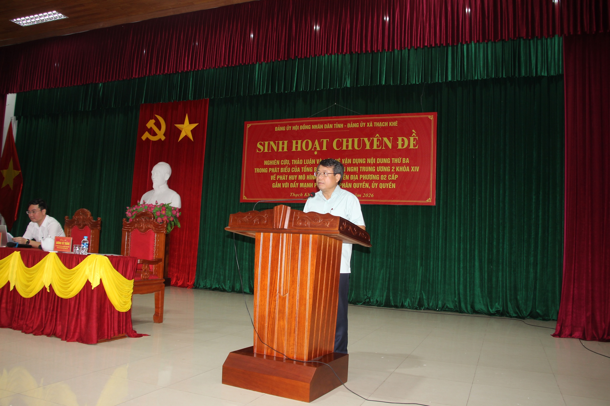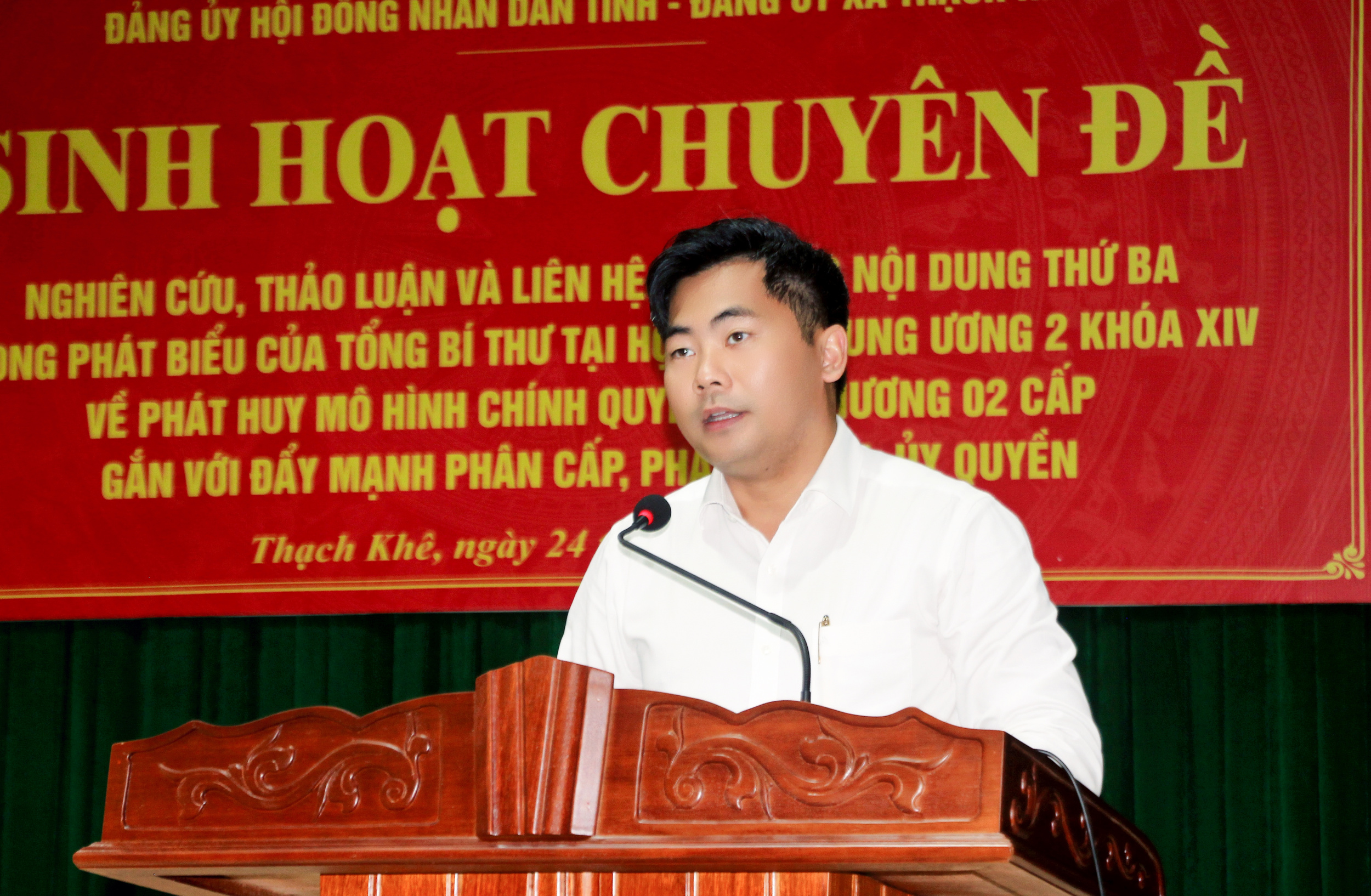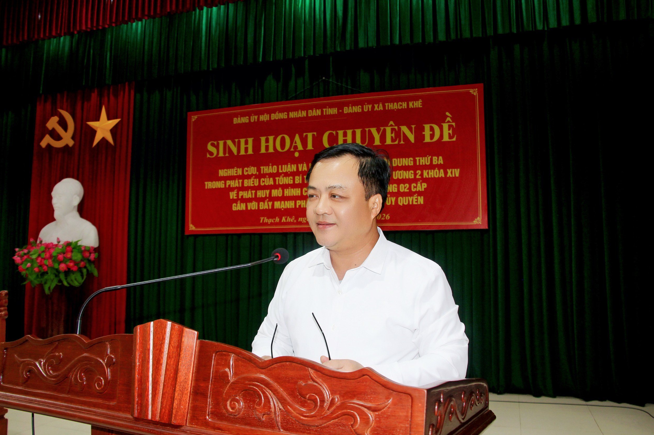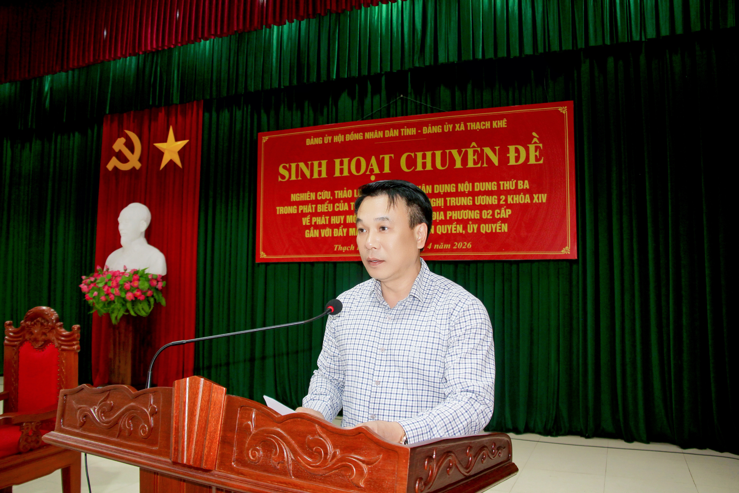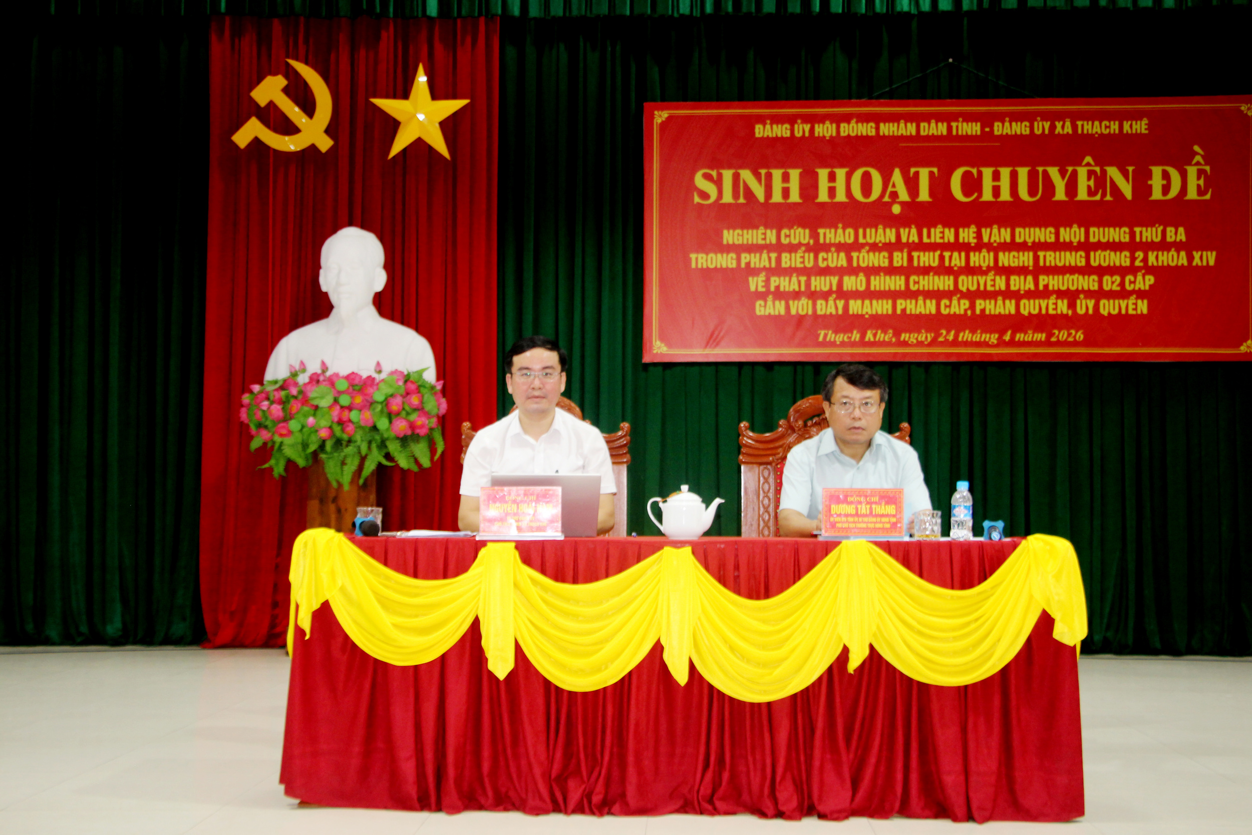 Chiều 24/4/2026, Đảng ủy Hội đồng nhân dân (HĐND) tỉnh đã phối hợp với Đảng ủy các xã: Thạch Khê, Thạch Lạc, Đồng Tiến tổ chức sinh hoạt chuyên đề quý II năm 2026, với chủ đề “Nghiên cứu, thảo luận và liên hệ vận dụng nội dung thứ ba trong phát biểu của Tổng Bí thư Tô Lâm tại Hội nghị Trung ương 2 khóa XIV về phát huy mô hình chính quyền địa phương 02 cấp gắn với đẩy mạnh phân cấp, phân quyền, ủy quyền”. Đồng chí Dương Tất Thắng, Ủy viên Ban Thường vụ Tỉnh ủy, Bí thư Đảng ủy HĐND tỉnh, Phó Chủ tịch Thường trực HĐND tỉnh; Nguyễn Hoài Nam, Bí thư Đảng ủy, Chủ tịch Hội đồng nhân dân xã Thạch Khê chủ trì buổi sinh hoạt chuyên đề.