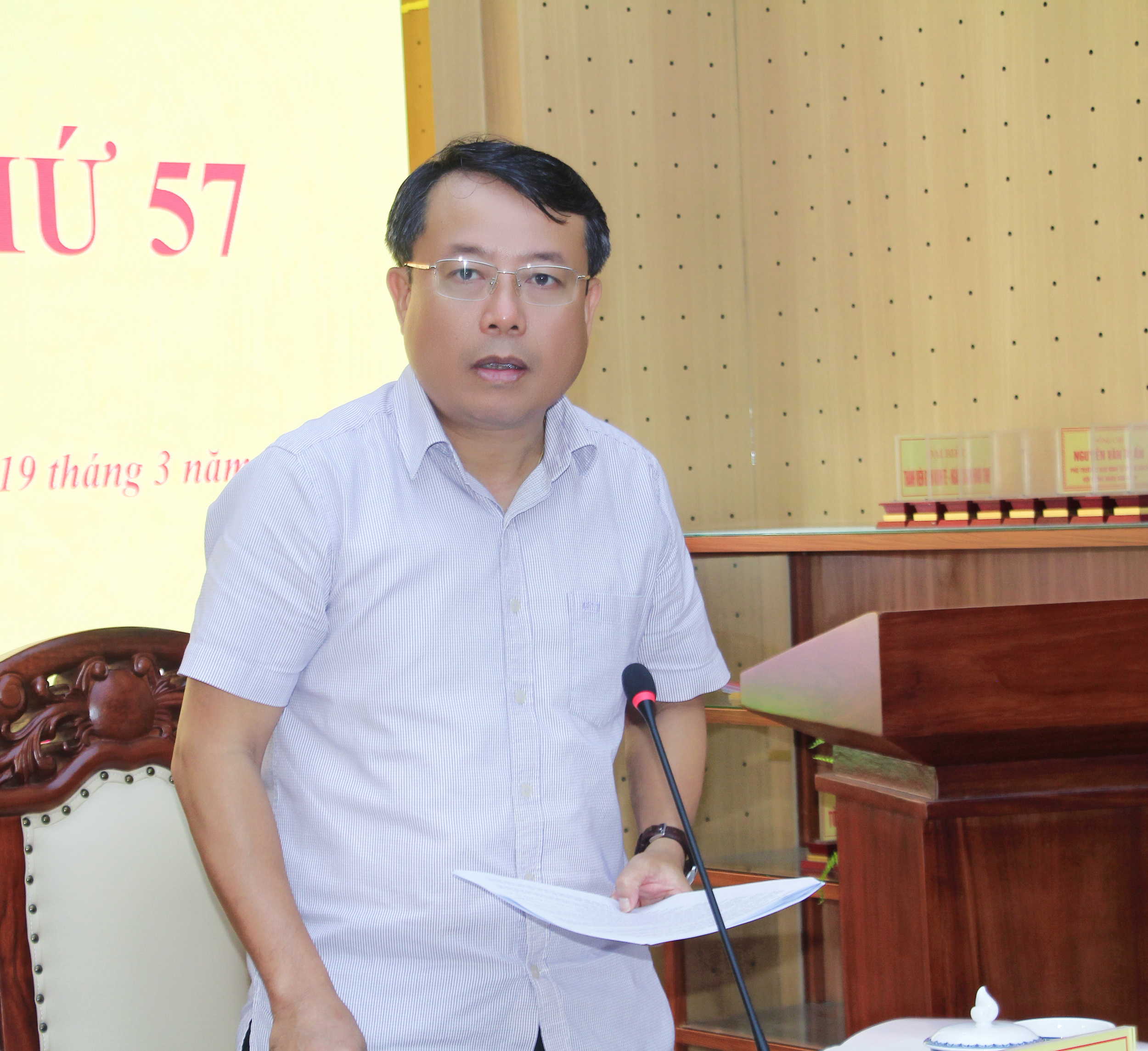 | Chánh Văn phòng Đoàn ĐBQH và HĐND tỉnh Nguyễn Huy Hùng báo cáo tại phiên họp |