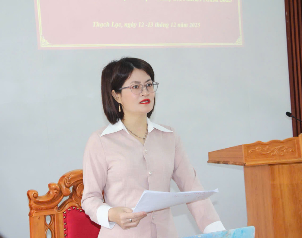 Bí thư Đảng ủy xã Thạch Lạc Nguyễn Thị Ái Liên phát biểu tại hội nghị. |