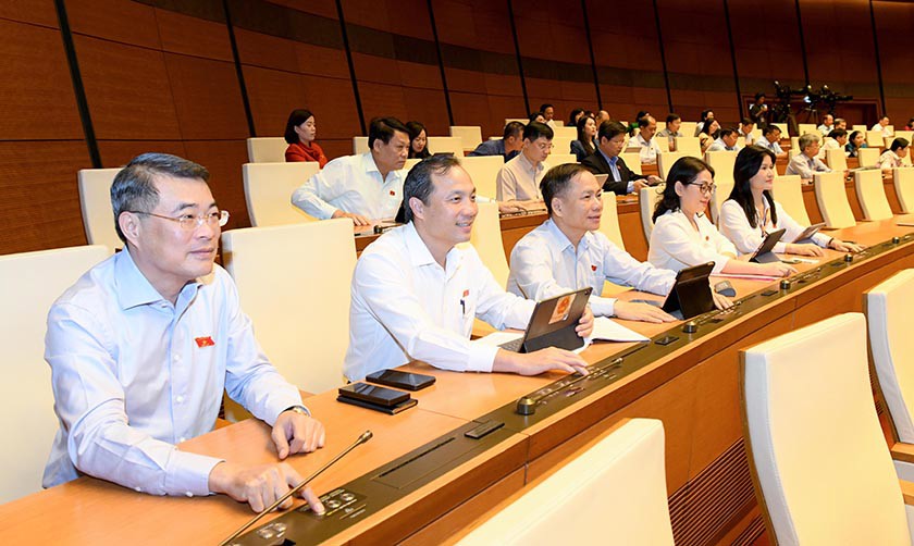 Các đại biểu Quốc hội đoàn Hà Tĩnh bấm bút thông qua các Luật tại kỳ họp Quốc hội. |