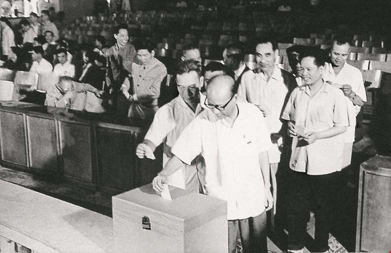 Chủ tịch Hồ Chí Minh bỏ phiếu bầu cử đại biểu Quốc hội khóa II tại tiểu khu Trúc Bạch,khu phố Ba Đình, Hà Nội, tháng 5/1960 |