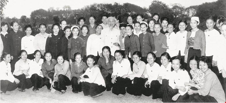 Chủ tịch Hồ Chí Minh chụp ảnh lưu niệm với các nữ đại biểu Quốc hộitại kỳ họp thứ 3, Quốc hội khóa III, tháng 4/1966 |