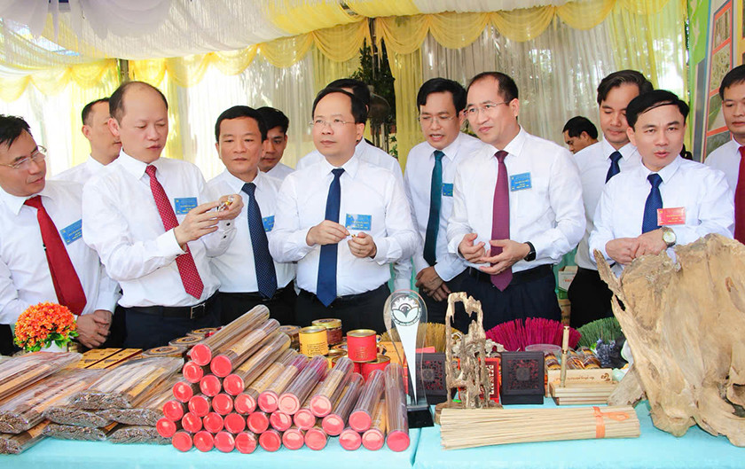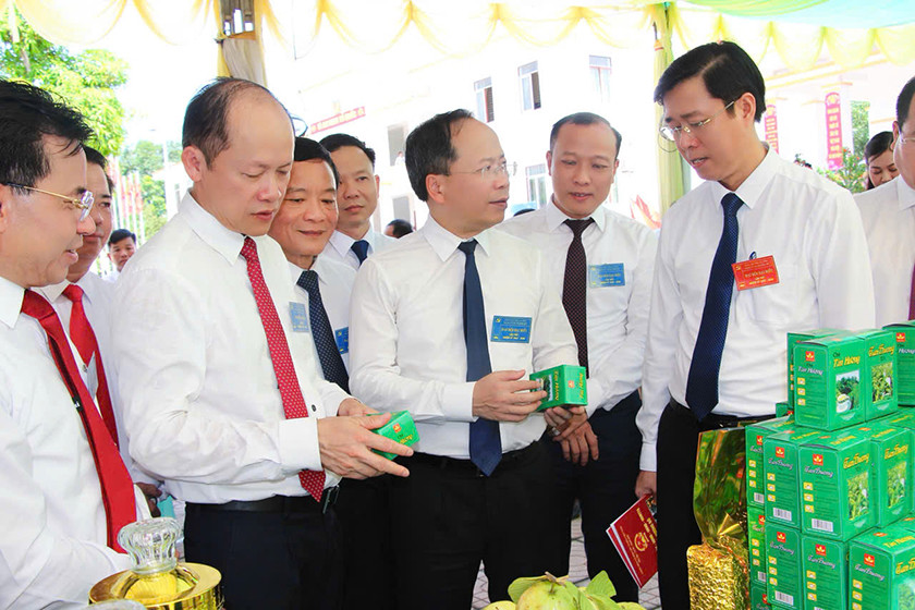 Đại biểu tham quan các gian hàng sản phẩm chủ lực của xã Hương Đô. |