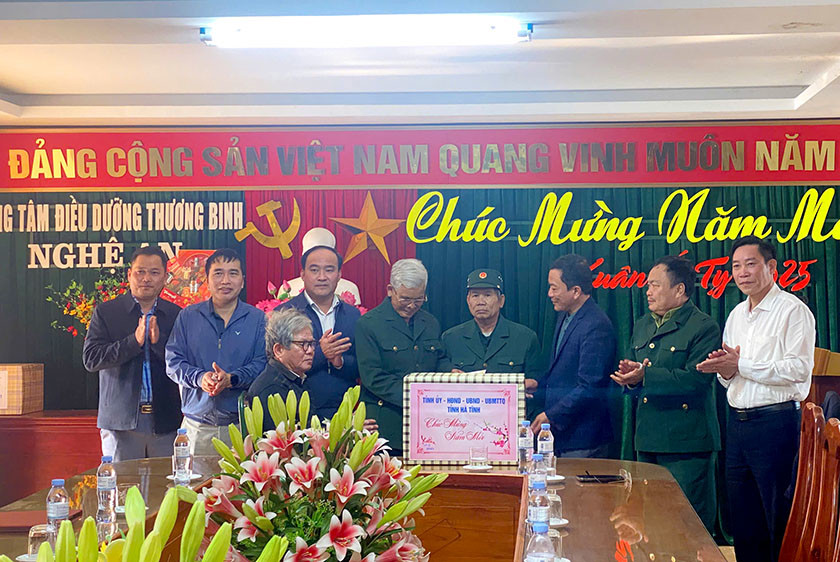 Tiếp đó, đoàn đã tới thăm hỏi, tặng quà tại Trung tâm Điều dưỡng thương binh Nghệ An là nơi quản lý, điều trị, điều dưỡng chăm sóc sức khỏe và đảm bảo chế độ chính sách cho thương binh, bệnh binh nặng của 2 tỉnh Nghệ An và Hà Tĩnh. Trung tâm hiện đang chăm sóc cho 57 thương bệnh binh, thân nhân liệt sỹ, trong đó có 23 người quê Hà Tĩnh.