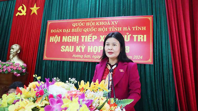 Thay mặt Đoàn ĐBQH tỉnh Hà Tĩnh, đại biểu Phan Thị Nguyệt Thu cảm ơn tình cảm, sự tin tưởng của cử tri đối với các ĐBQH. Những ý kiến đóng góp của cử tri là cơ sở để ĐBQH kiến nghị với Chính phủ và các bộ, ngành liên quan có giải pháp triển khai hiệu quả hơn nữa cơ chế, chính sách cho nhân dân. Những đề xuất, kiến nghị của cử tri, Đoàn ĐBQH tỉnh tiếp thu, tổng hợp để phản ánh đến các cơ quan có thẩm quyền và báo cáo Quốc hội xem xét, giải quyết trong thời gian tới.