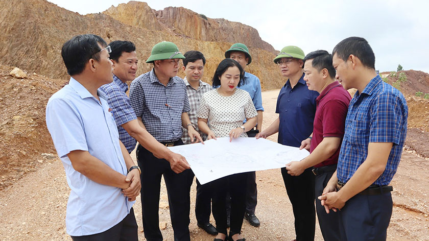 Cùng ngày, Tổ tham mưu, giúp việc tiến hành kiểm tra hồ sơ, khảo sát thực tế tại mỏ đất san lấp xã Thạch Xuân, huyện Thạch Hà. Theo báo cáo, Công ty cổ phần Đầu tư và Thương mại Tràng An Việt Nam được Ủy ban nhân dân tỉnh cấp giấy phép khai thác khoáng sản số 4161/GP-UBND ngày 24/12/2021 của UBND tỉnh Hà Tĩnh, loại khoáng sản khai thác đất san lấp, khai thác bằng phương pháp lộ thiên, có trữ lượng địa chất 1.529.329m3; trữ lượng khai thác 1.386.153m3 với công suất khai thác 130.000 m3 nguyên khai/năm; thời hạn khai thác 13 năm. Mỏ đất san lấp có chiều cao tầng khai thác 5m, góc nghiêng sườn tầng 40độ; khai thác từ trên xuống dưới, chiều cao khai thác 97m (từ cao độ +247m đến cao độ +150m); diện tích khai thác 7ha; Chiều rộng mặt bằng tầng công tác tối thiểu 24m. Tuyến đường khai thác 1,79 km, độ dóc 8%, chiều rộng đường 9-10m, mặt đường xe chạy 6m, lề 1m, gốc nghiêng taly < 63độ; chiều rộng thoát nước 1 m, sâu 0,5; thiết bị máy đào komasu PC400 (2 cái); Ô tô tẹc 01 cái; trạm cân 01; camera 01 bộ. Hố lắng, mương thoát nước, nhà bảo vệ.