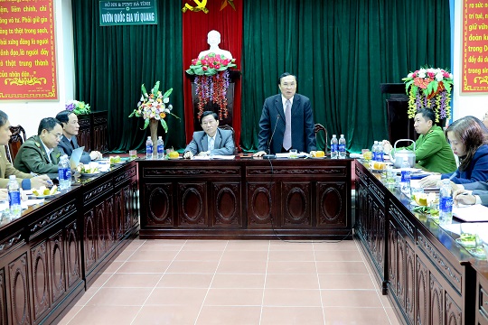 Phát biểu tại cuộc làm việc đồng chí Võ Hồng Hải đánh giá cao những kết quả đạt được của Vườn quốc gia Vũ Quang trong thời gian qua, nhất là công tác bảo vệ rừng dựa vào cộng đồng, công tác phòng cháy chữa cháy, xử lý các hành vi vi phạm, bảo vệ nguồn động, thực vật quý hiếm phục vụ cho công tác bảo tồn, đa dạng sinh học và nghiên cứu khoa học… Để phát huy những giá trị của Vườn quốc gia trong thời gian tới, đồng chí Phó chủ tịch HĐND tỉnh đề nghị Vườn quốc gia cần làm tốt hơn nữa công tác quản lý, bảo vệ rừng đặc dụng; xây dựng đề án về chức năng, nhiệm vụ, cơ cấu tổ chức bộ máy để báo cáo Sở Nông nghiệp - Phát triển nông thôn trình lên UBND, HĐND tỉnh theo đúng thẩm quyền; tiếp tuc kêu gọi các chương trình, dự án để bảo vệ nguồn tài nguyên vườn quốc gia, nhất là công tác xã hội hóa để khai thác tiềm năng, lợi thế sẵn có, nhất là sau khi hồ Ngàn Trươi - Cẩm Trang tích nước; trước mắt đề nghị Lãnh đạo sở Nông nghiệp - Phát triển Nông thôn tham mưu cho UBND tỉnh giao quyền quản lý mặt hồ Ngàn Trươi - Cẩm Trang cho Vườn quốc gia Vũ Quang… Đối với những kiến nghị đề xuất của Vườn quốc gia, đề nghị sở Nông nghiệp và Phát triển Nông thôn tổng hợp trình UBND, HĐND để đưa vào chương trình kỳ họp HĐND tỉnh trong thời gian tới.