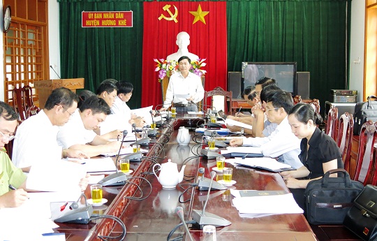 Tại buổi làm việc với UBND huyện Hương Khê, Đoàn đã nghe báo cáo công tác quản lý bảo vệ rừng và phòng cháy, chữa cháy rừng năm 2012, triển khai kế hoạch năm 2013 và việc triển khai NQ 33/ 2012/NQ – HĐND. Theo đó, Hương khê có tổng diện tích rừng và đất lâm nghiệp là 101.598, 70 ha trải dài trên 22 xã. Năm 2012, để bảo vệ rừng đạt kết quả cao, công tác tổ chức, chỉ đạo, kiểm tra, thực hiện được huyện chủ động triển khai. Trước hết là việc củng cố và kiện toàn Ban chỉ huy các vấn đề cấp bách trong BVR – PCCCR, toàn huyện đã thành lập 32 Ban với số 506 người; thành lập 32 đội xung kích chữa cháy rừng với 1.007 người; ký họp đồng BVR – PCCCR với 20 người tại 20 xã.