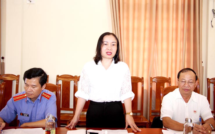 Phó Trưởng ban Pháp chế HĐND tỉnh Nguyễn Thị Nhuần phát biểu tại cuộc làm việc.