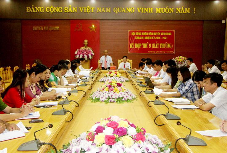 Sáng ngày 31/7/2019, HĐND huyện Vũ Quang đã tổ chức kỳ họp thứ 9 (kỳ họp bất thường) khóa IV, nhiệm kỳ 2016 - 2021 để thông qua Nghị quyết về điều chỉnh địa giới hành chính và sắp xếp các đơn vị hành chính cấp xã.